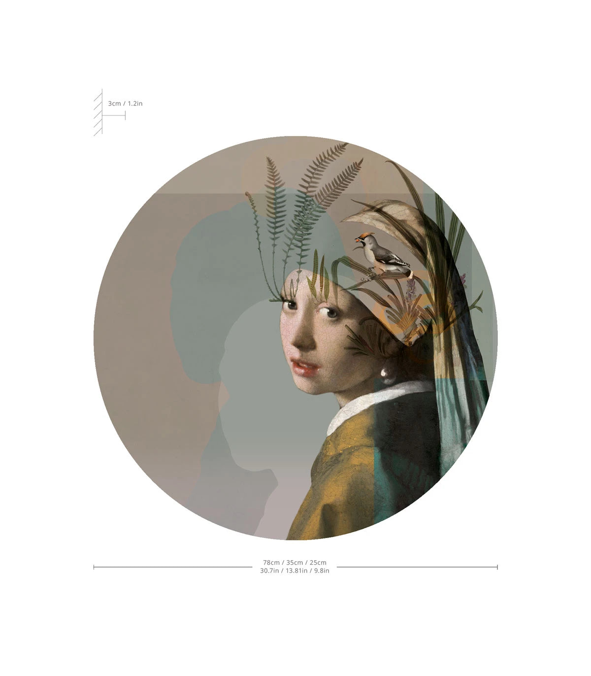 Wandlamp Dots Lighting Nature Girl with the Pearl is een bijzondere verlichting die de klassieke schoonheid van kunst combineert met een moderne decoratieve vorm. Geïnspireerd door het beroemde werk van Johannes Vermeer, toont de illustratie een meisje met een parel omringd door subtiele, plantaardige motieven, en creëert zo een compositie vol elegantie, tederheid en artistieke expressie. Het subtiele licht benadrukt de zachte contouren van de illustratie, waardoor het een edel, sfeervol karakter krijgt.