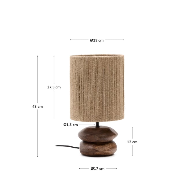 Lampa stołowa Kor to wyjątkowy element, który wprowadza do wnętrza rustykalny urok i naturalne akcenty. Wykonana z rzeźbionego drewna akacjowego w ciemnym wykończeniu, zachwyca unikalnymi teksturami i starannym rękodziełem. Ręcznie pleciony klosz z liny jutowej nadaje jej ciepły, organiczny charakter, idealnie wpisując się w naturalne i przytulne aranżacje.
