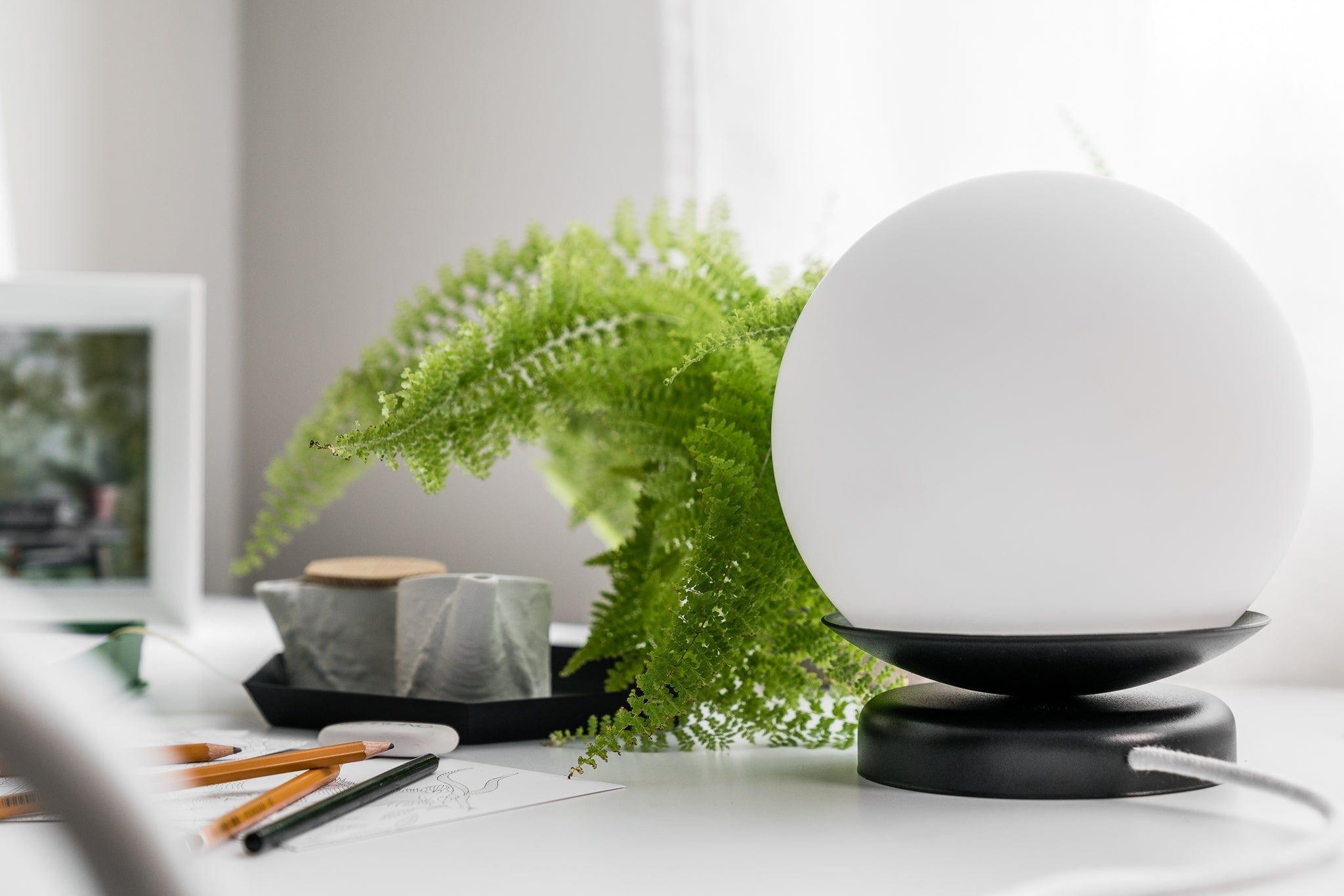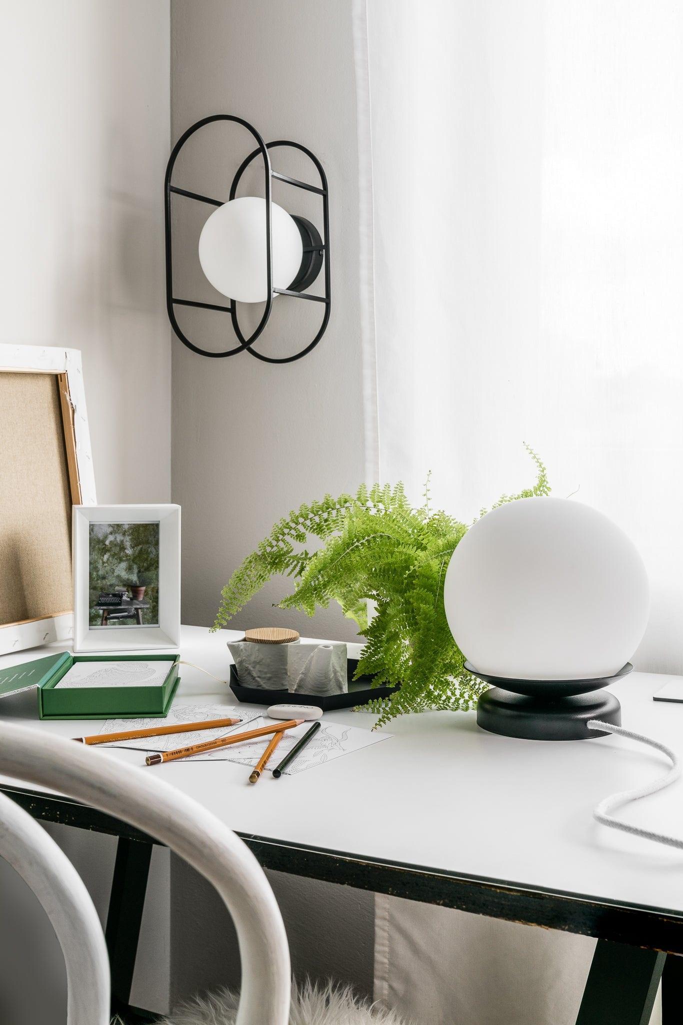 Bureaulamp Kuul is een compacte armatuur die subtiel de ruimte aanvult. De bolvormige kap, geplaatst op een geometrische voet, doet denken aan een lichtobject dat overdag een elegante accent vormt en 's avonds een gezellige sfeer creëert. Dankzij de kleine afmetingen is hij perfect voor een nachtkastje, bureau, ladekast of vensterbank.