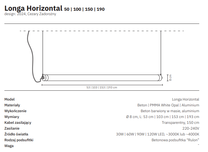 Lampa wisząca pionowa LONGA mleczny klosz z betonowym detalem