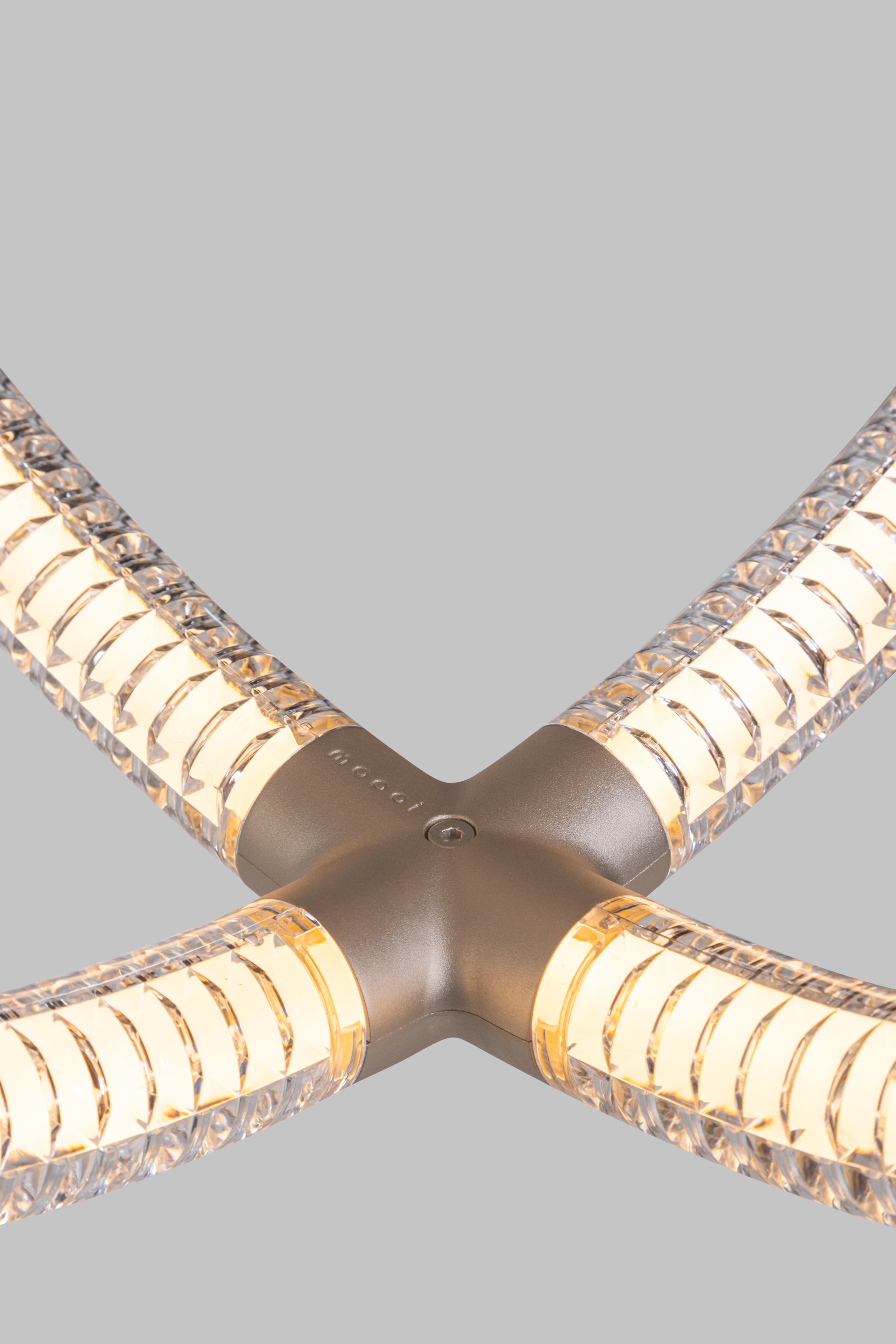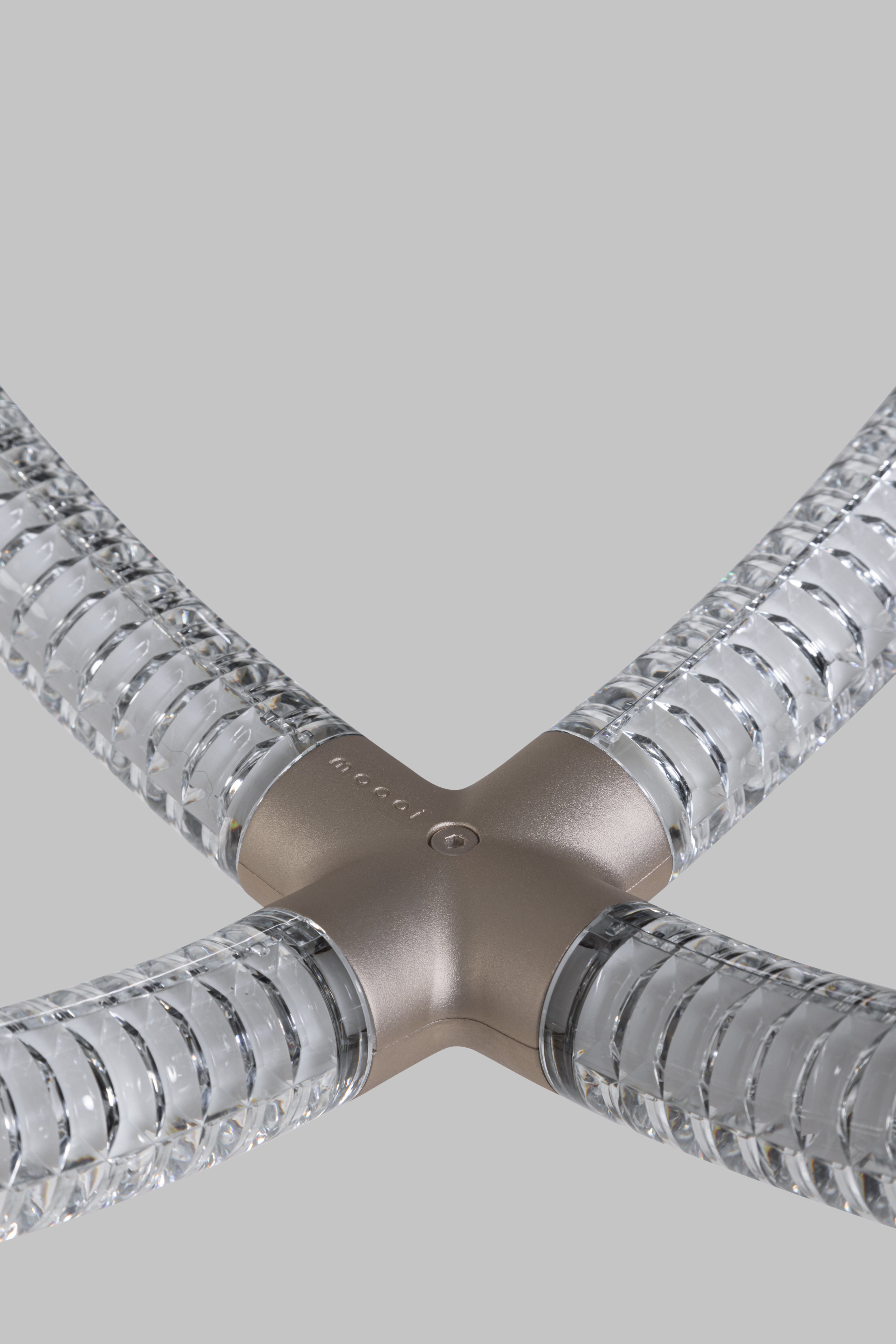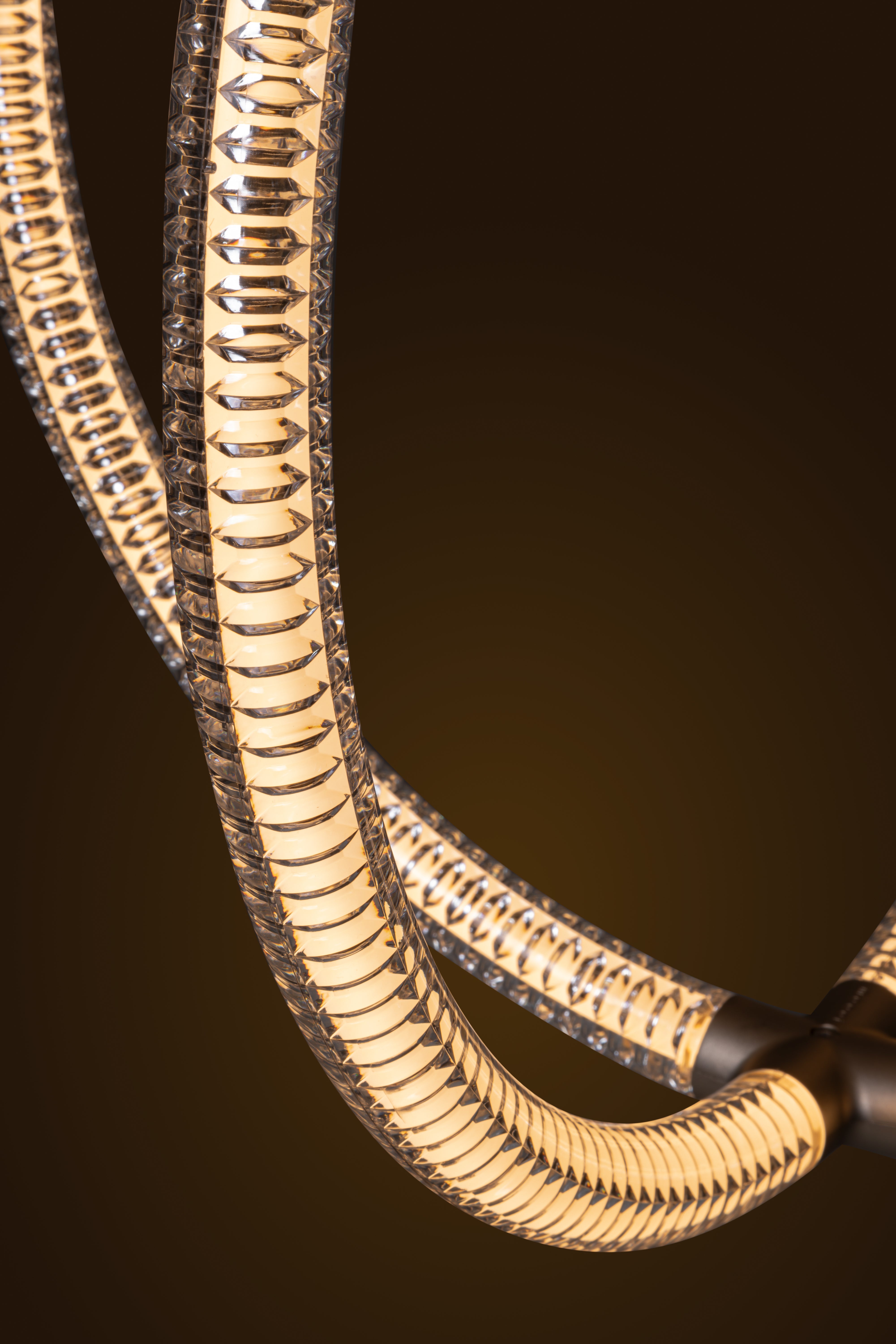 Hanglamp Luminora is een modern kunstwerk dat verfijnde esthetiek en geavanceerde technologie combineert. Het unieke ontwerp verwijst naar de elegantie van Murano-glas en benadrukt de symmetrie geïnspireerd op de gulden snede. Transparante LED-buizen, omringd door een vakkundig ontworpen diamanten patroon in de vorm van een "v", creëren een hypnotiserend spel van licht en schaduw.