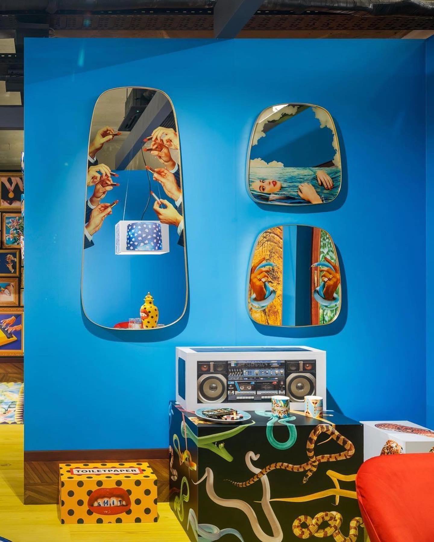 Unieke spiegel in een gouden lijst is een onderdeel van een unieke collectie, gecreëerd door de Italiaanse koning van de avant-garde Seletti en het tijdschrift Toiletpaper. Een interessante, licht controversiële collage, als een poort naar een andere, surrealistische dimensie, geeft het interieur een onmiskenbaar karakter.