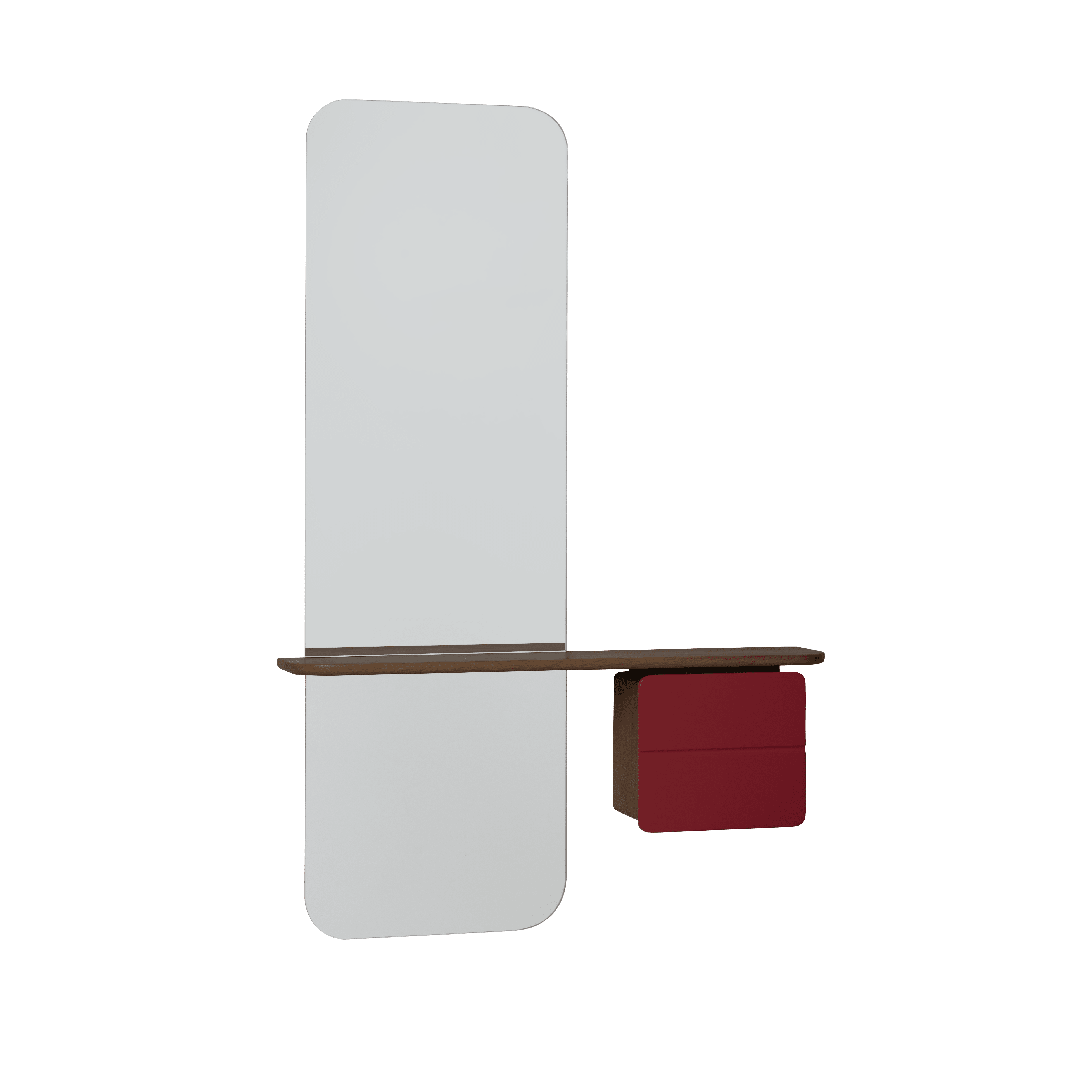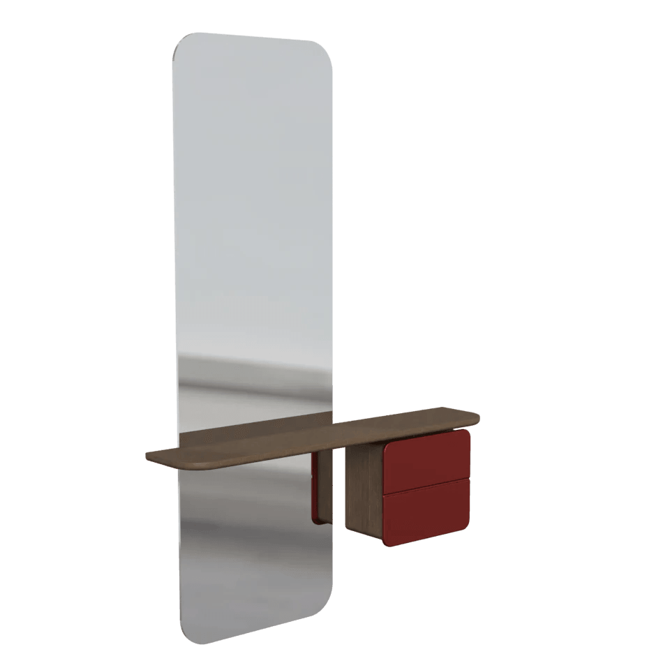 Dankzij de juiste hoogte biedt de spiegel een reflectie over de gehele lengte, wat het mogelijk maakt om perfect voorbereid de deur uit te gaan. Bovendien is de spiegel uitgerust met een plank en een kleine kast met een praktisch spiegeltje en een leren dienblad – een ideale oplossing voor het opbergen van dagelijkse voorwerpen zoals sleutels, cosmetica, zonnebrillen of reserve munten.