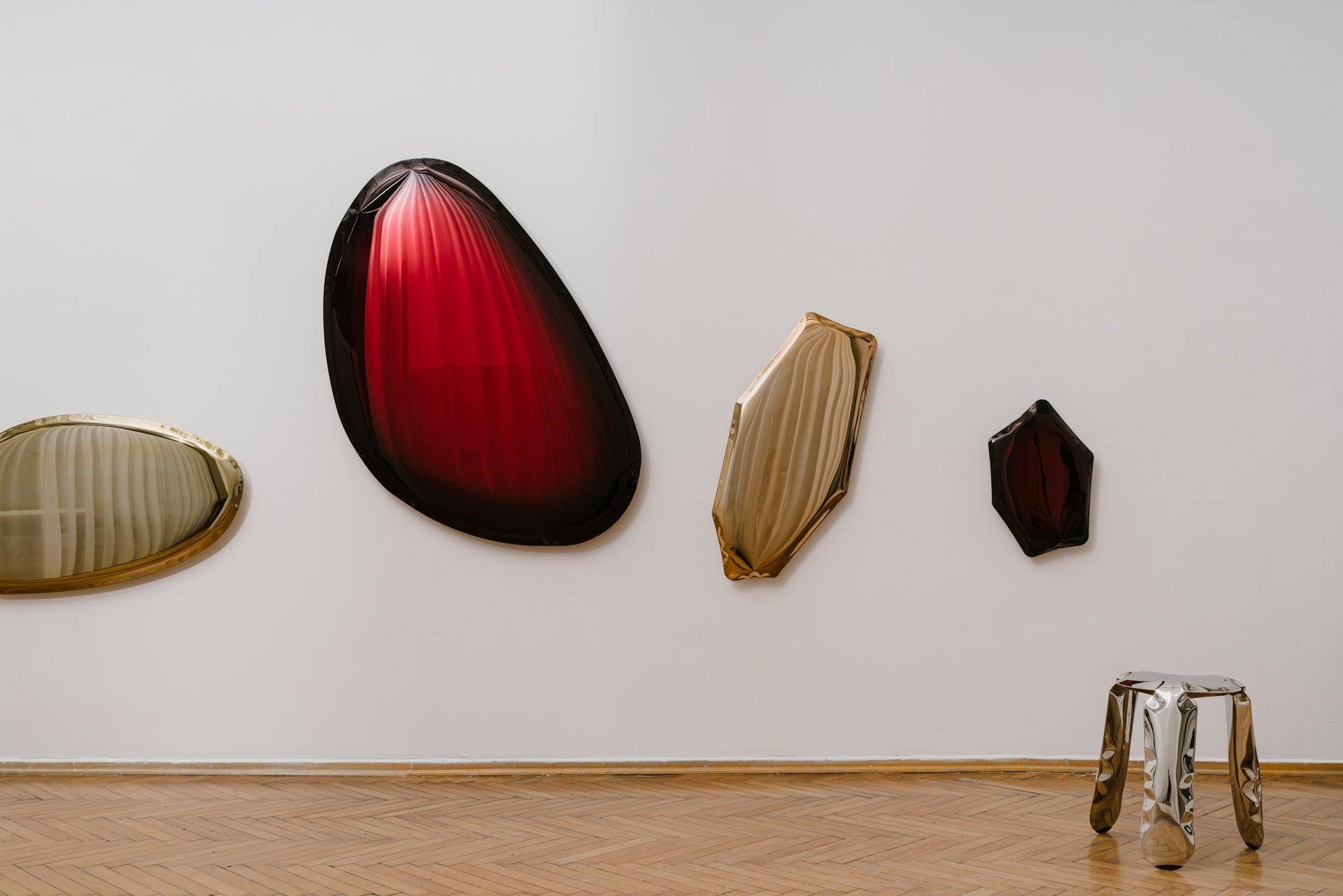 De onregelmatige vervormingen aan de randen van de tafla zijn uniek en onvervangbaar. Hun ontstaan is het resultaat van een gedurfde experimentatie met metalen materialen, waarbij de vrije vervorming van metaal onder luchtdruk hen een onmiskenbaar karakter geeft. Elk van deze objecten is uniek en draagt verhalen van reflecties en vertellingen van weerkaatsingen in zich, die zowel raadselachtig als verleidelijk zijn.