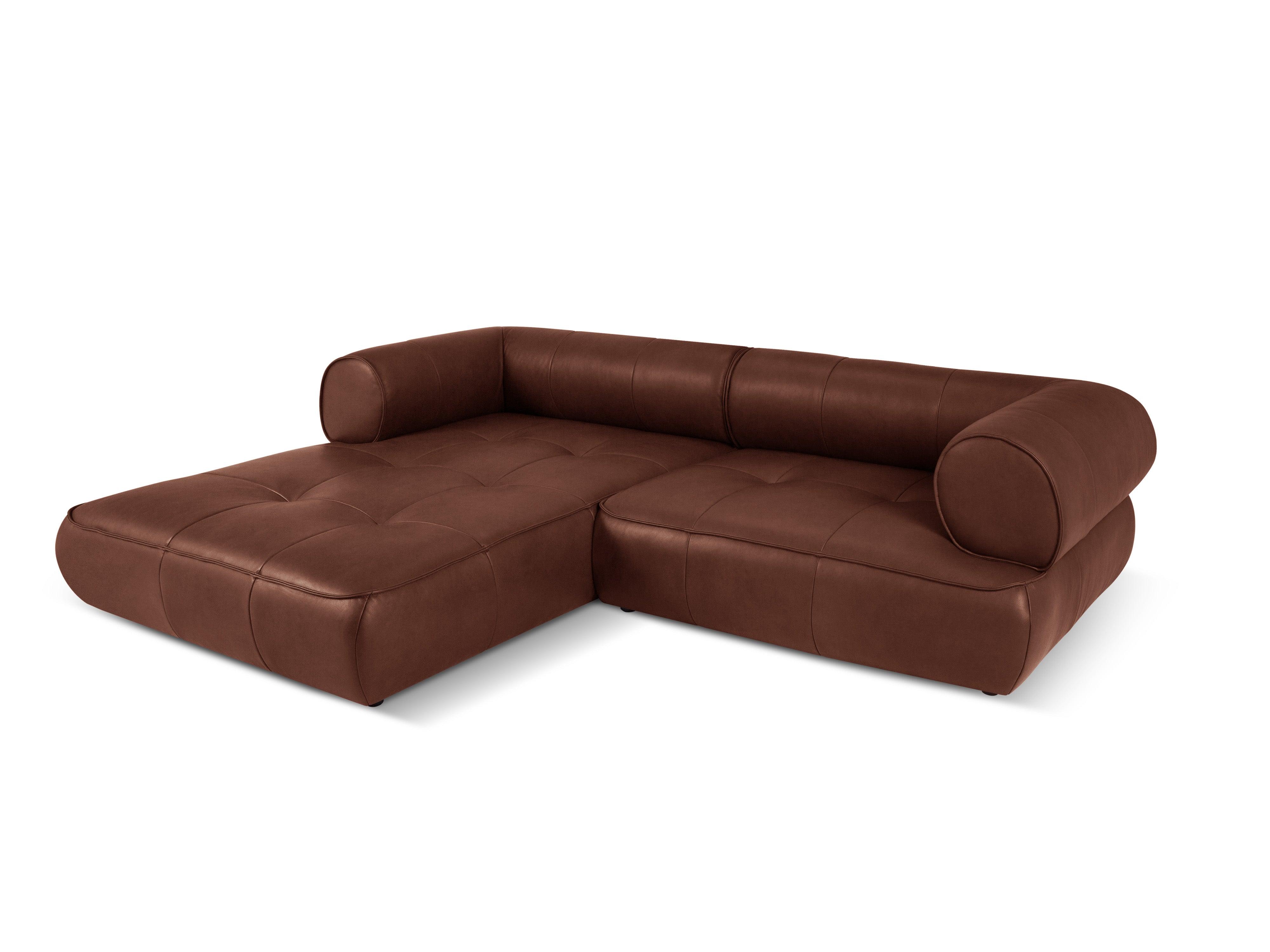 Leren hoekbank voor vier personen Lily voegt een vleugje tijdloze elegantie toe aan elk interieur. De unieke vorm is het resultaat van een moderne benadering van klassieke leren meubels. De afgeronde randen van de zittingen hebben een bijzonder originele vorm, terwijl de stijlvolle rugleuningen zorgen voor het juiste comfort tijdens het ontspannen.