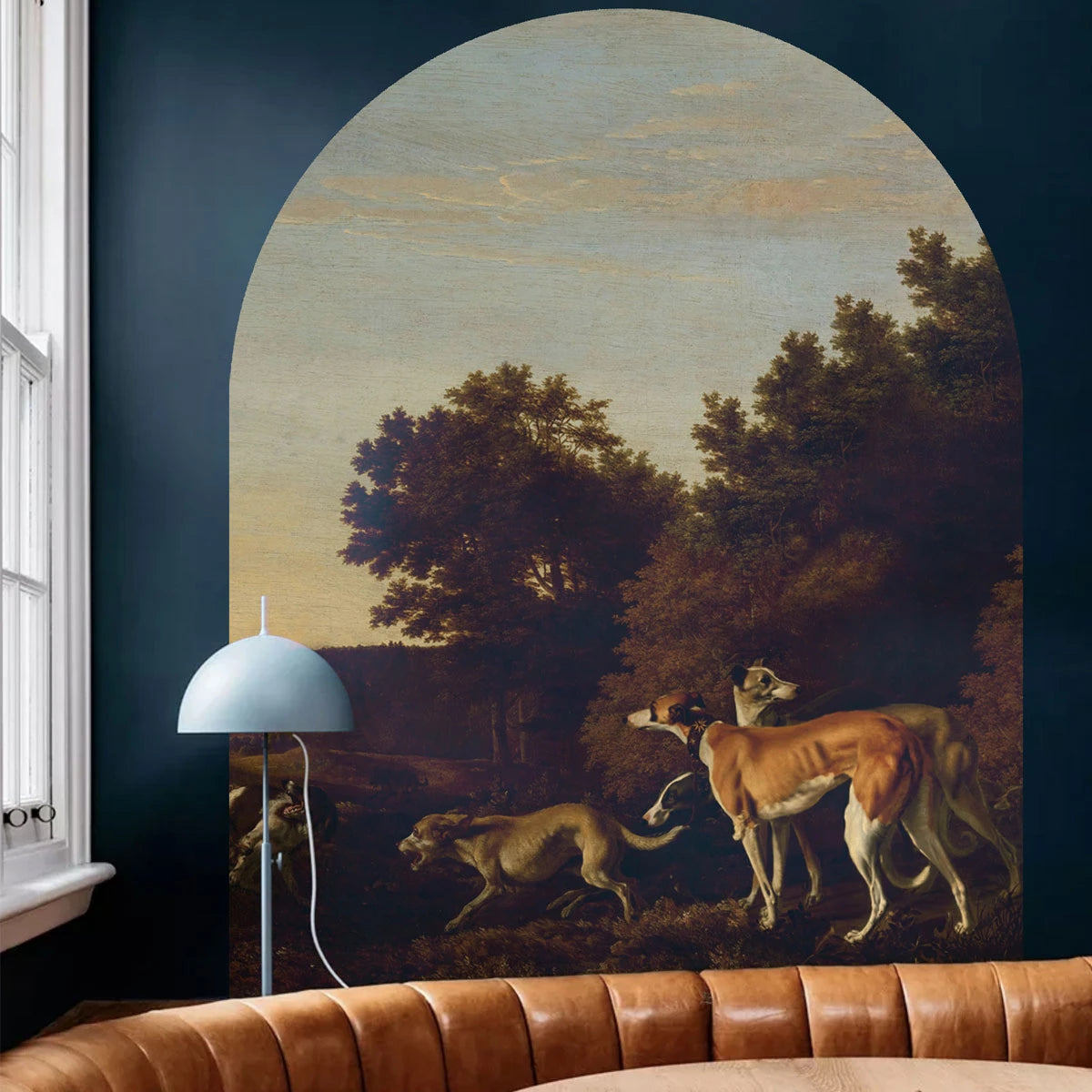 Mural w kształcie łuku Chart to dekoracja ścienna z klasycznym motywem sceny myśliwskiej z psami na tle natury, która wprowadza do wnętrza elegancję oraz ponadczasowy charakter. Realistyczne detale i subtelne odcienie nadają kompozycji wyrafinowania, tworząc harmonijny obraz inspirowany tradycją i sztuką dawnych epok. Mural staje się stylowym akcentem, który ociepla przestrzeń i podkreśla jej dostojny klimat.