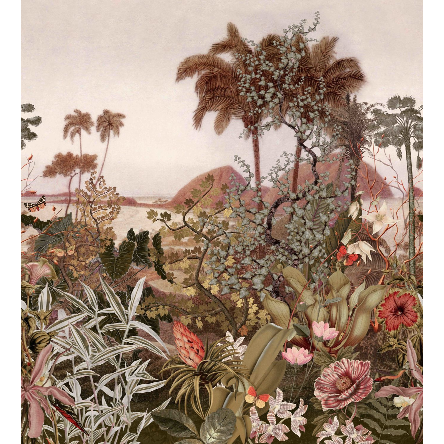 De muurschildering Kisama brengt u naar een tropische tuin vol leven en kleur. Tussen weelderige klimplanten en palmen verstoppen zich kleurrijke vogels en vlinders, terwijl hibiscus, schelpen-gember en orchideeën de compositie aanvullen. De compositie is geplaatst tegen een achtergrond met een textuur die doet denken aan natuurlijke vezels, wat de interieurs een warme, gezellige uitstraling geeft. Dit unieke ontwerp brengt een vleugje exotiek en natuur in de inrichting, en wordt een opvallend middelpunt in elke ruimte.