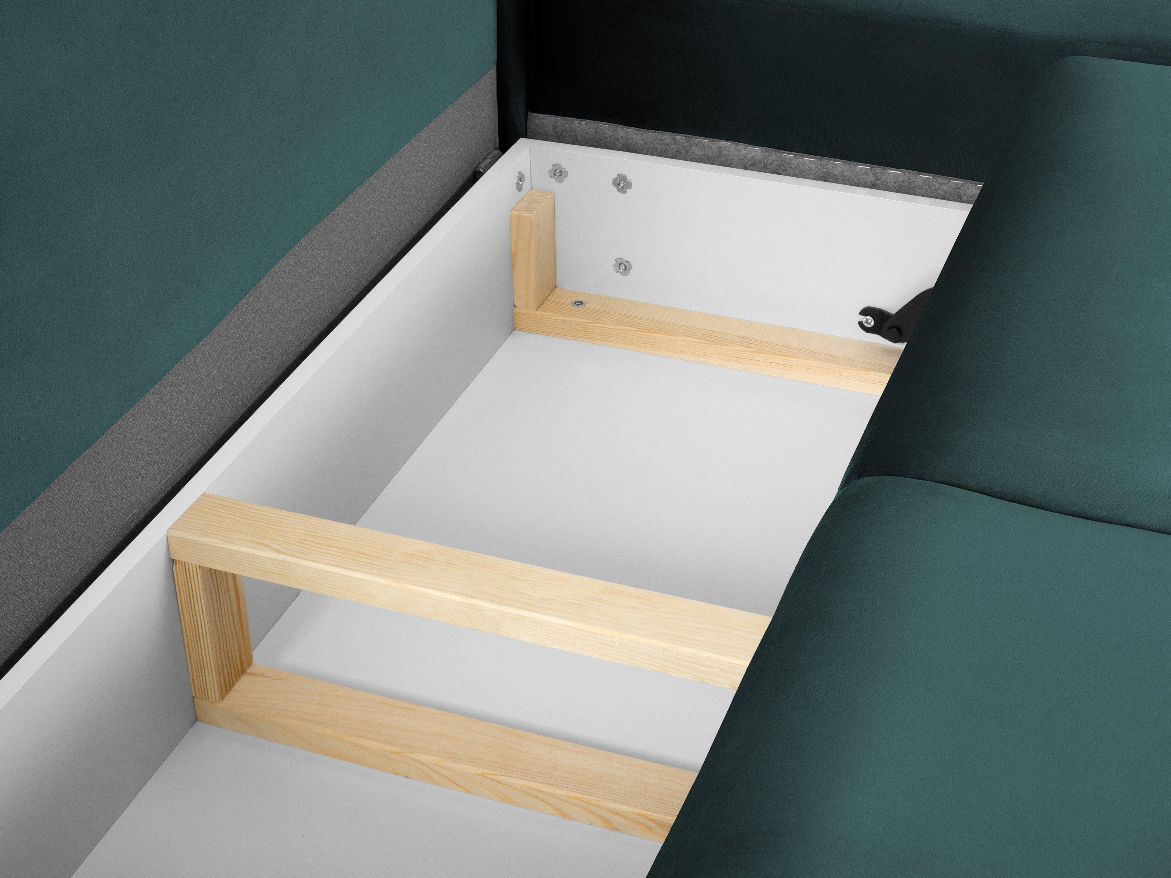 De hoekbank verrast niet alleen met zijn uiterlijk, maar is ook een functionele aanvulling voor een gezellige woonkamer. In een handomdraai kan hij worden omgevormd tot een comfortabel bed met praktische opbergruimte voor beddengoed. Dit is de ideale oplossing voor onverwachte gasten of multifunctionele ruimtes. Het kijken naar uw favoriete serie met het gezin of een middagdutje na een zware dag krijgt een geheel nieuwe dimensie met zo'n comfortabel rustpunt.