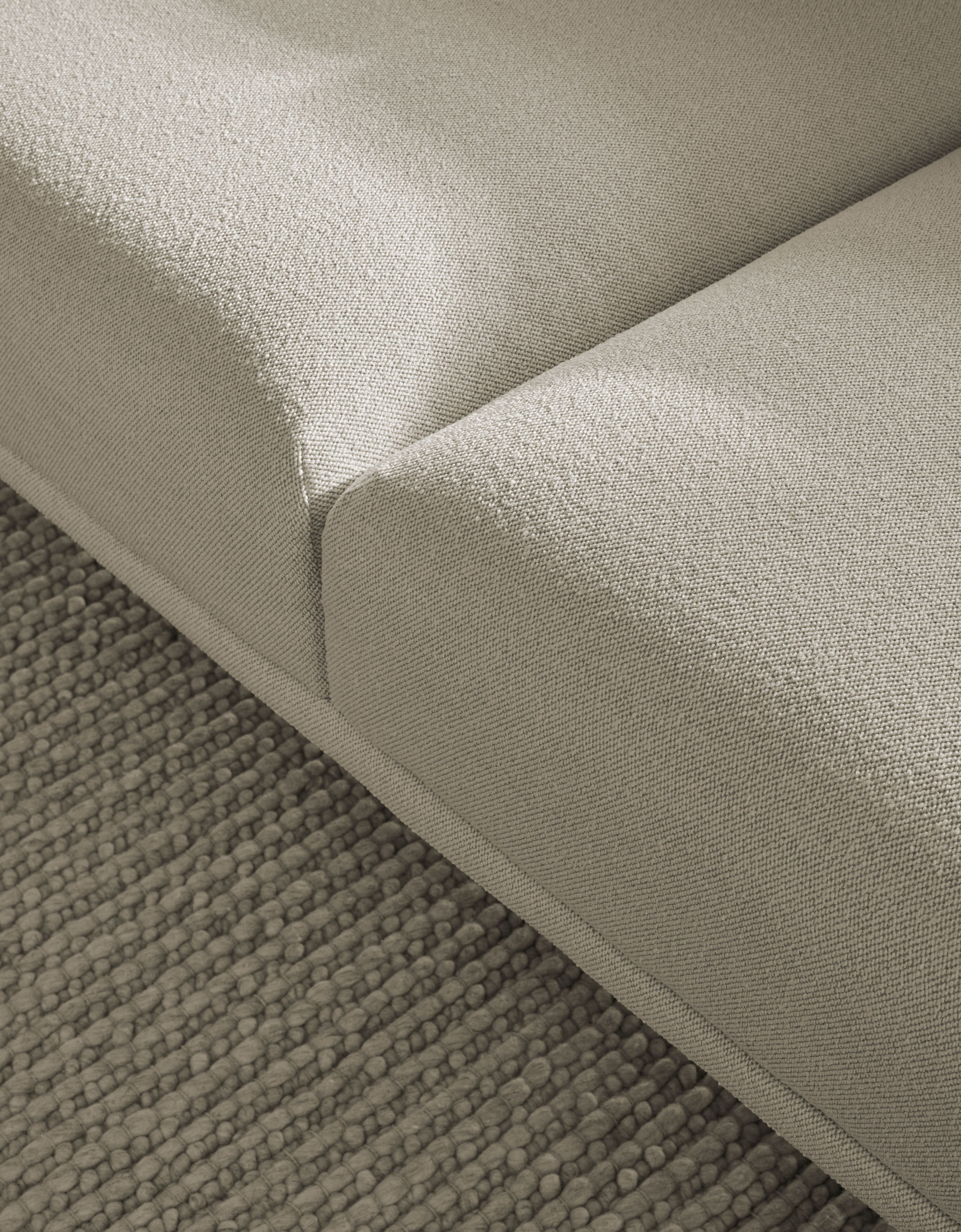 Symmetrische hoekbank Caisa valt op door zijn elegante en verfijnde uitstraling, met strakke lijnen die hem een gevoel van lichtheid geven, alsof hij zweeft op een slanke stalen frame. Zijn subtiele, moderne ontwerp brengt harmonie en verfijning in elk interieur.