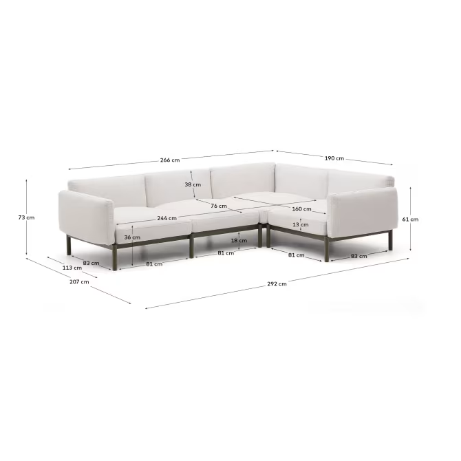 Dankzij de modulaire constructie biedt de beige hoekbank Sorells u de mogelijkheid om de indeling en grootte aan te passen aan uw behoeften, zodat u de beschikbare ruimte optimaal kunt benutten en de ideale omgeving voor ontspanning en buitenbijeenkomsten kunt creëren.