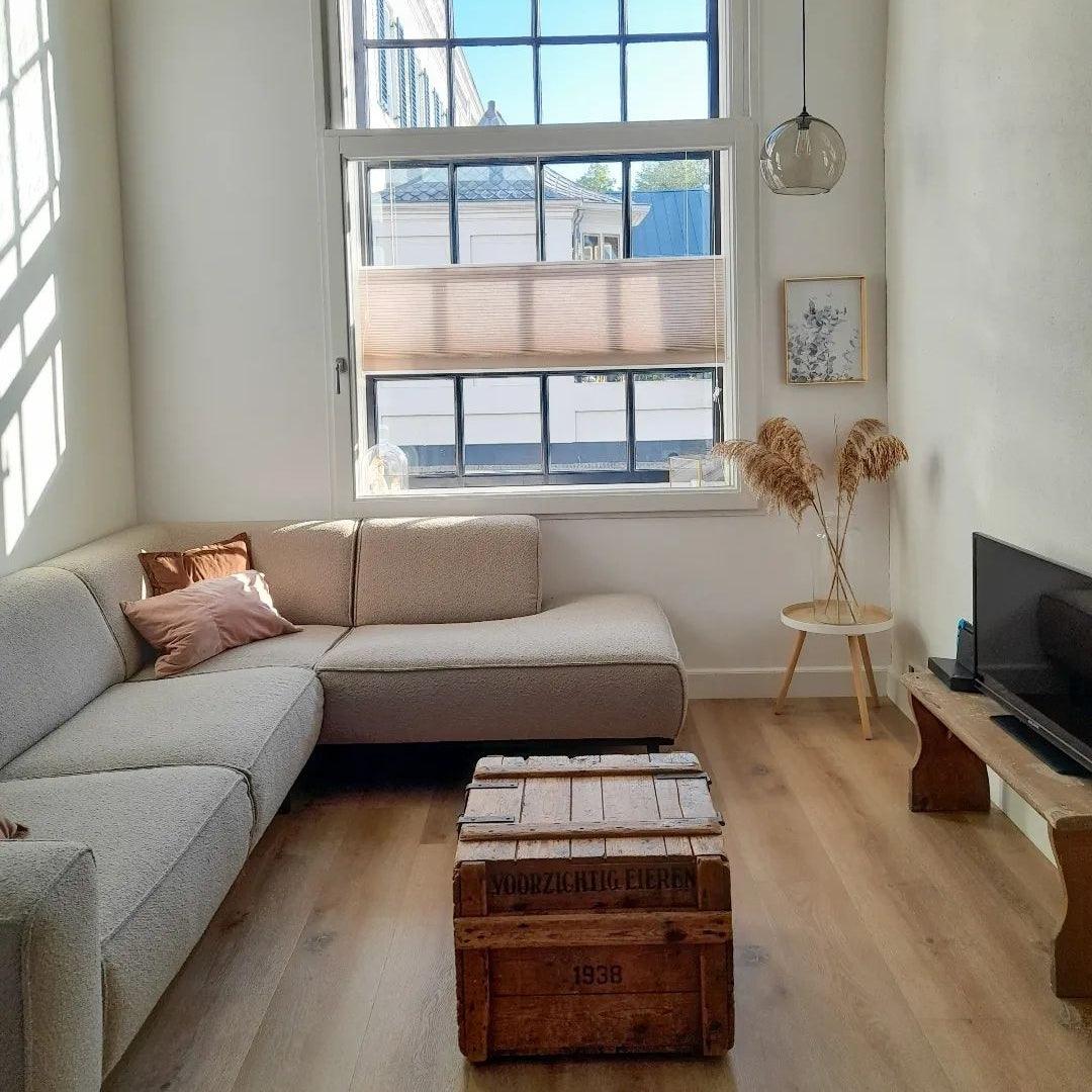 De hoekbank is ook beschikbaar in fluwelen, velours, corduroy, kunstleer en suède.