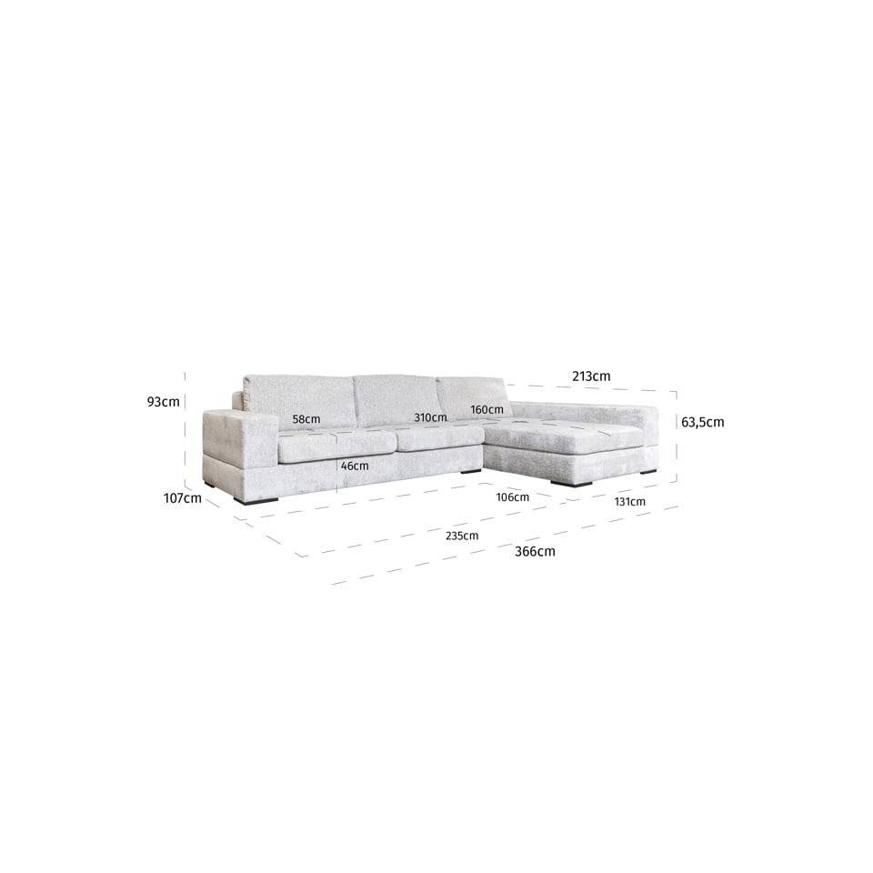 De gehele hoekbank Pasha is afgewerkt met een prachtige lichte stof die hem een elegante en subtiele uitstraling geeft. Deze stof voegt niet alleen charme toe aan de hoekbank, maar zorgt ook voor comfort tijdens het gebruik.