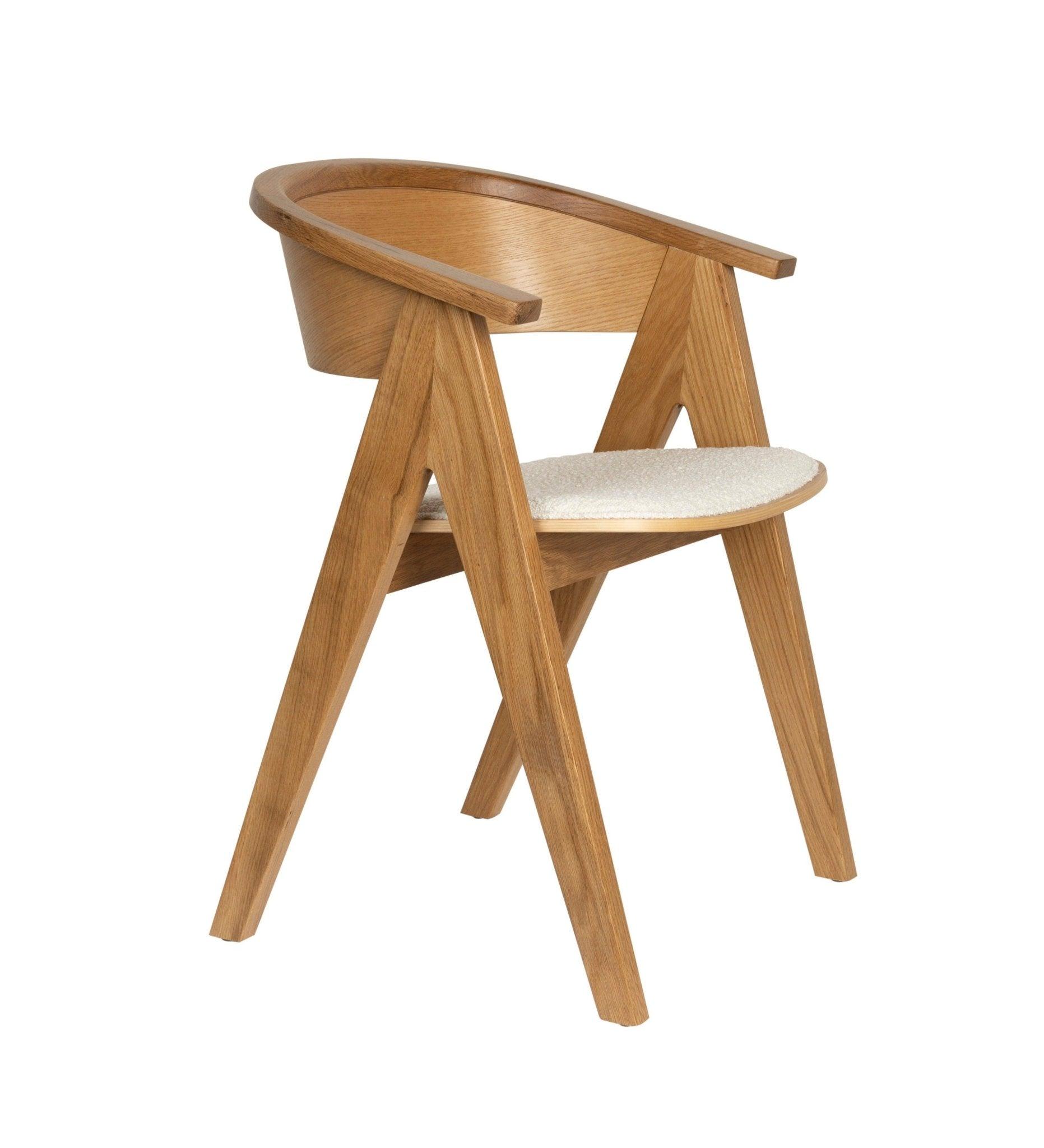 De zitting is bekleed met bouclé stof, wat zorgt voor een zachte zitoppervlakte.