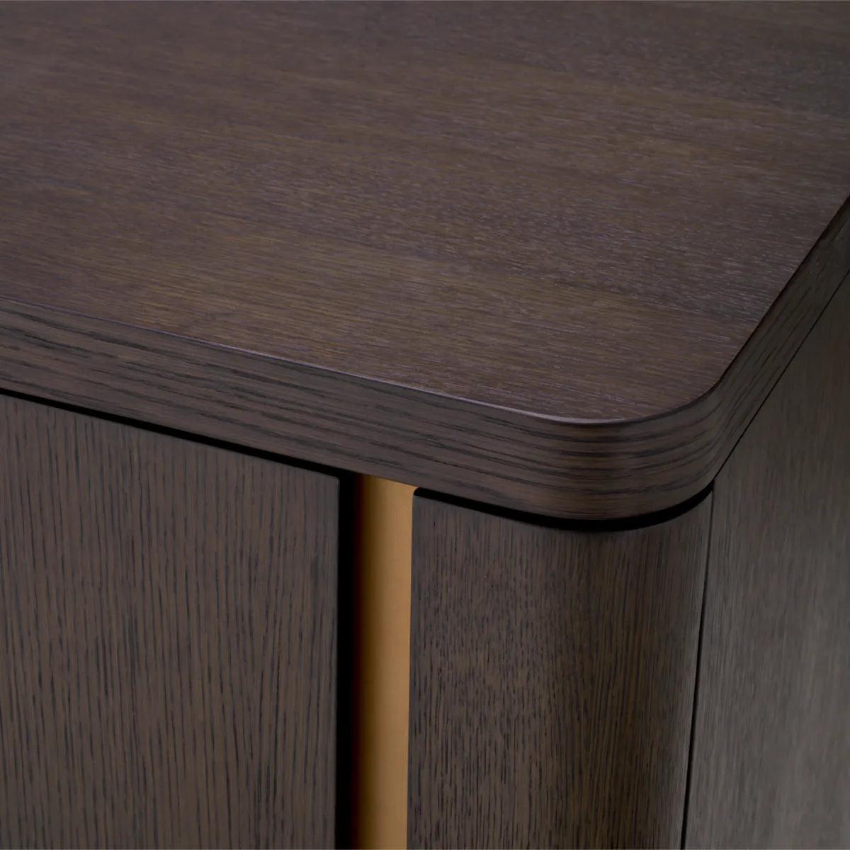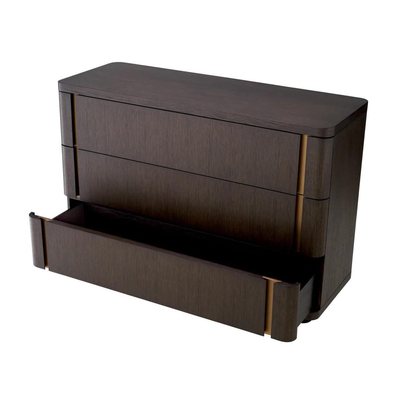 Commode Modesto is de belichaming van perfectie in detail, een mix van klasse en functionaliteit. Haar elegante lijnen en verfijnde afwerkingen spreken de meest veeleisende estheten aan, en nodigen uit om haar meesterlijke constructie van dichtbij te bekijken. De chocoladebruine tint in eikenfineer roept een sfeer van luxe op, terwijl de afwerking in geborsteld messing een verfijnde, metallic accent toevoegt, wat het geheel een chique karakter geeft.