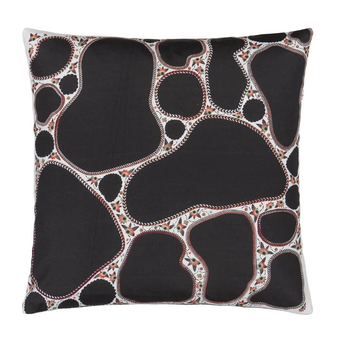 Moderne kussen ontworpen door Christian Lacroix met grafische afbeeldingen van citroenen, samengevoegd in draaiende vormen die contrasteren met de zwarte achtergrond. Een terugkeer naar uniforme zwarte motieven met een kleine bloemachtige schub in de achtergrond. Dit stijlvolle kussen zal de inrichting van uw interieur bij Maison Lacroix aanvullen.