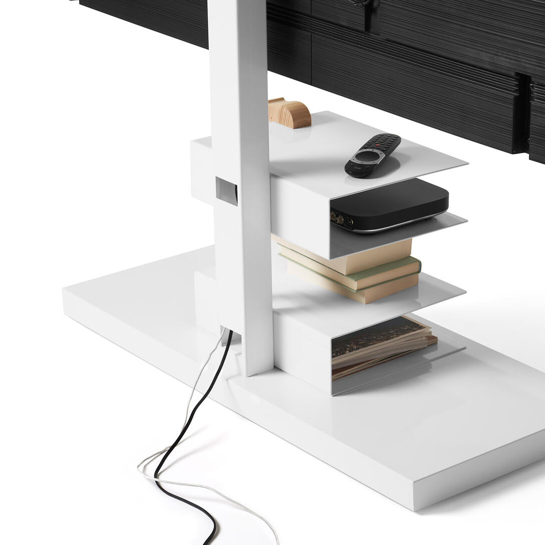 Ptolomeo Tv Smart – moderne tv-standaard met een designkarakter. Het ontwerp van Bruno Rainaldi is een elegante en functionele oplossing voor de behoeften van hedendaagse multimedia-gebruikers. De gelakte constructie van staal biedt plaats aan televisies met een diagonaal van 43 tot 82 inch (VESA-standaard), terwijl het tegelijkertijd esthetisch kabelbeheer en twee stalen planken voor RTV-accessoires biedt.