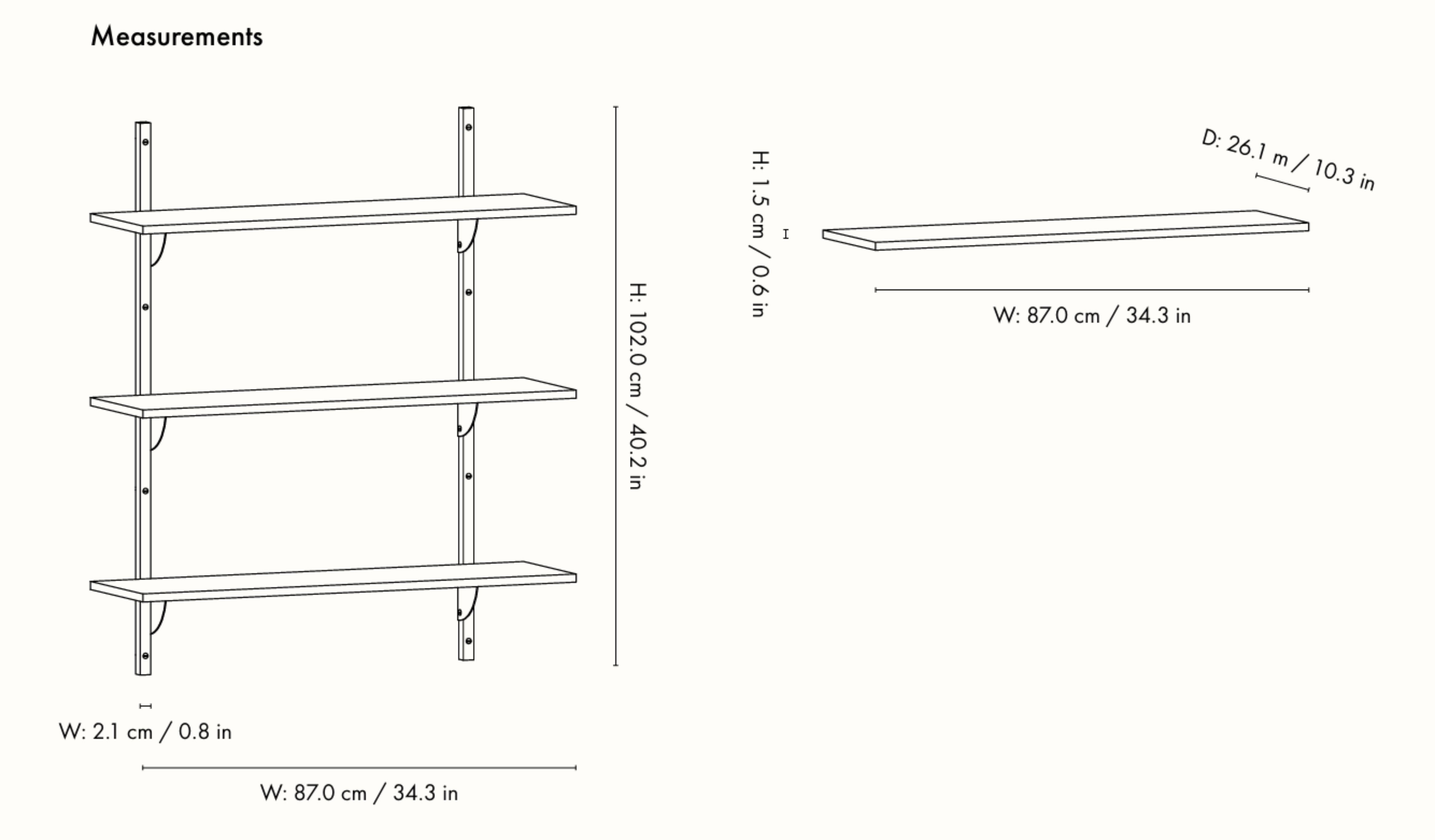 Materiały: Półki: czarny fornir jesionowy z rdzeniem MDF, Profile: lite drewno jesionowe bejcowane na czarno, Wsporniki: mosiądz