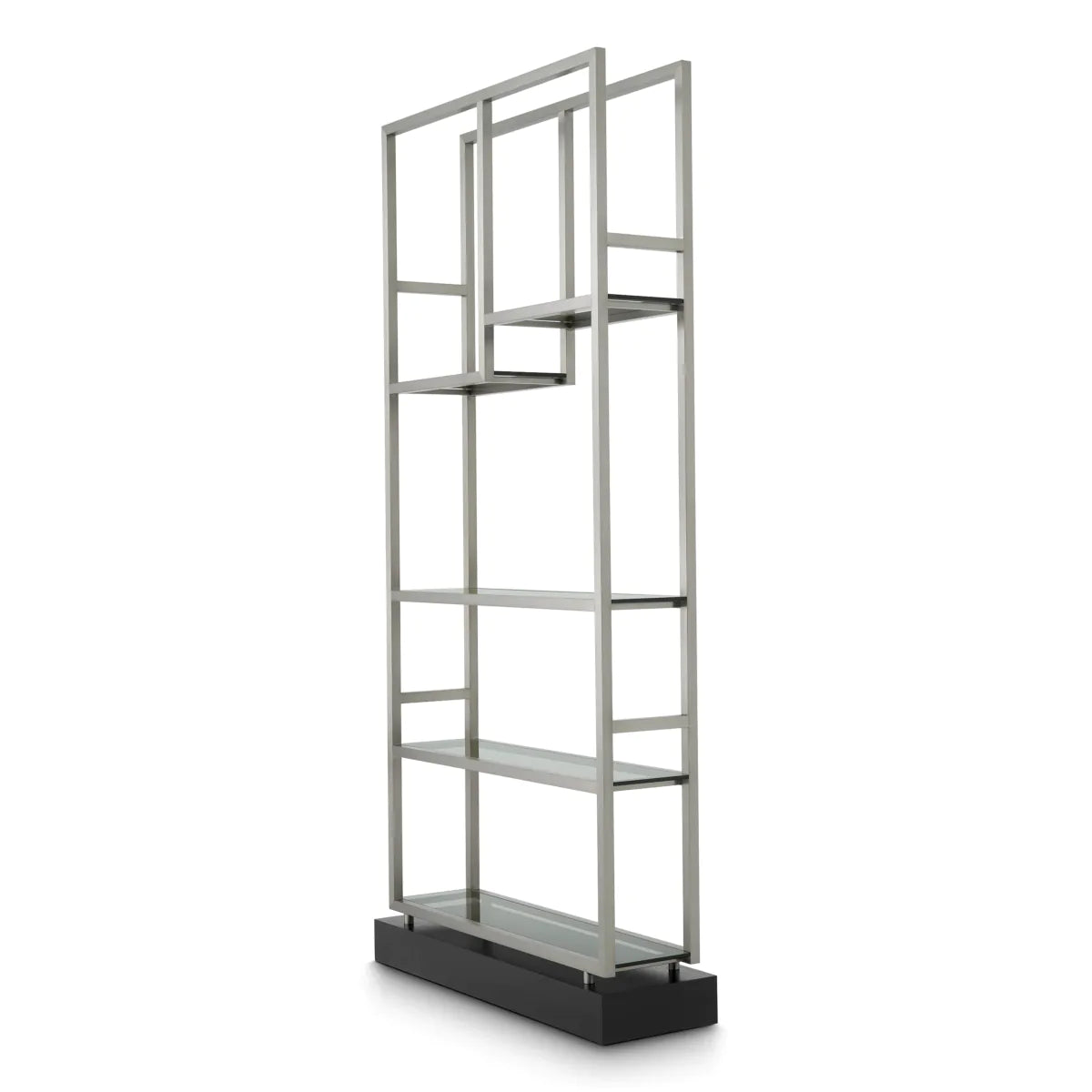 Boekenkast Corrado I is een combinatie van sculpturale elegantie en hedendaags design. Zijn slanke, geometrische constructie in geborsteld staal harmoniseert prachtig met de subtiele planken van rookglas, waardoor een gevoel van lichtheid en verfijning ontstaat.
