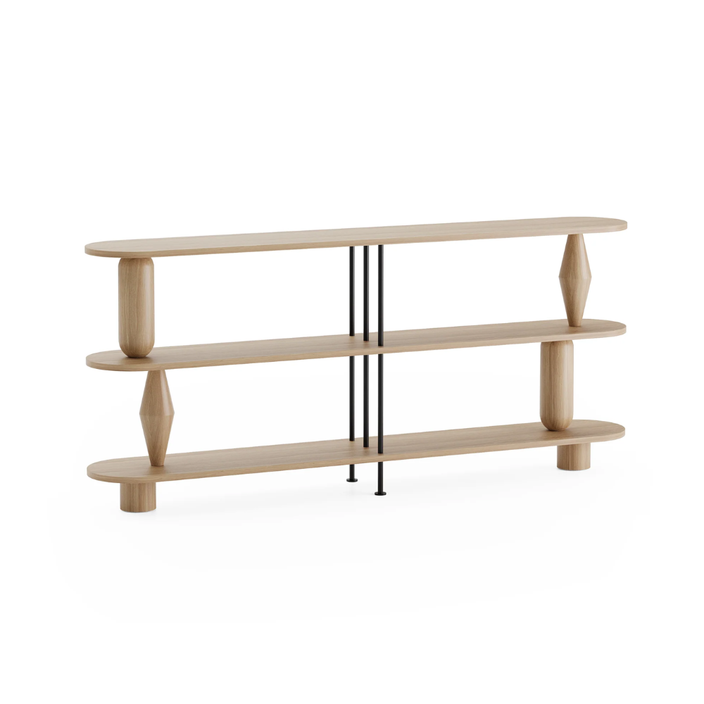 Regał Vazoo Duo to nowoczesna interpretacja systemu półek, w której estetyka spotyka się z funkcjonalnością. Toczone, rzeźbiarskie elementy przypominające wazy nadają meblowi wyjątkowy charakter i stają się jego znakiem rozpoznawczym. Dzięki zastosowaniu lekkich, ażurowych detali ze stali malowanej proszkowo, całość zachowuje wizualną lekkość, doskonale wpisując się zarówno w minimalistyczne, jak i bardziej eklektyczne wnętrza.