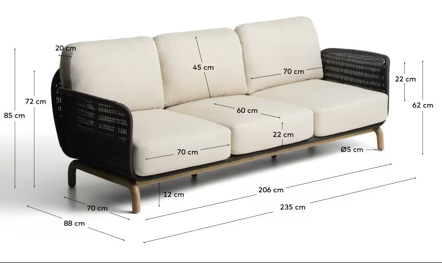 De zitting, gemaakt van handgeweven touw dat bestand is tegen UV-straling, en de zachte kussens met afneembare hoezen, zorgen ervoor dat de 3-zits tuinbank een hoog comfort biedt voor dagelijks gebruik. Duurzame materialen en een solide afwerking garanderen dat de bank zijn esthetische uitstraling lange tijd behoudt, zelfs bij intensief gebruik. Dit is de ideale keuze voor mensen die functionaliteit, comfort en een natuurlijke stijl waarderen in de inrichting van hun ontspanningsruimte.