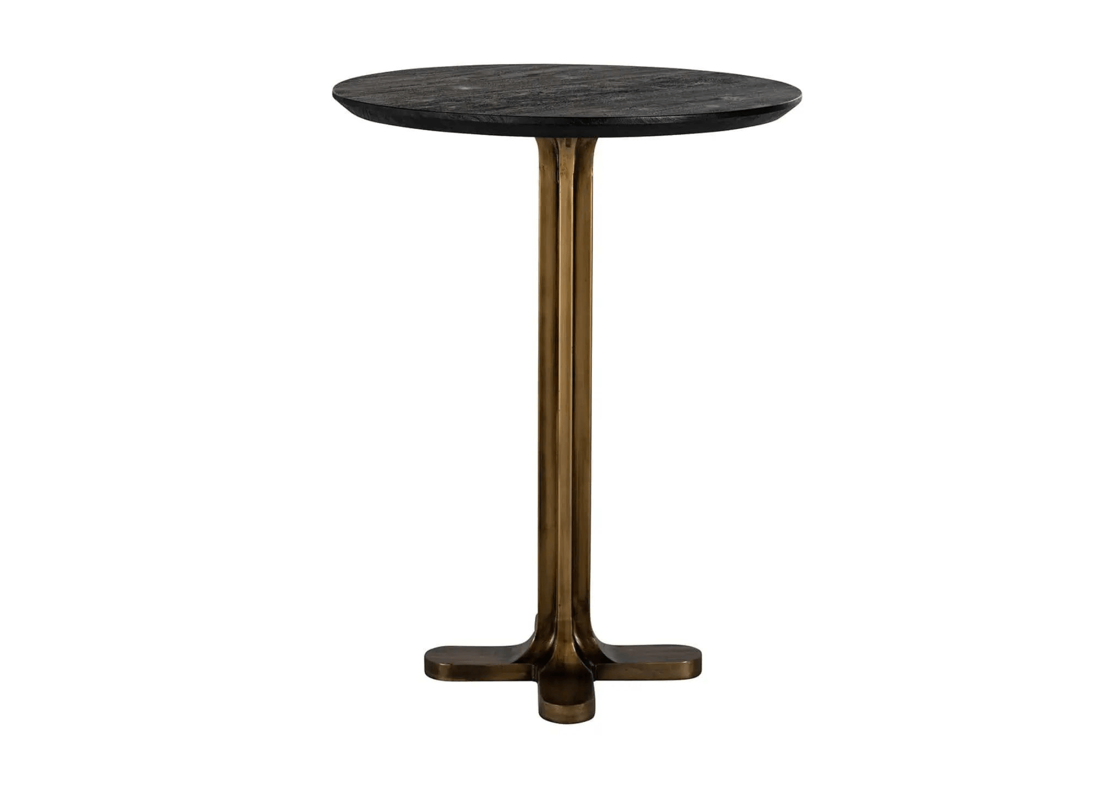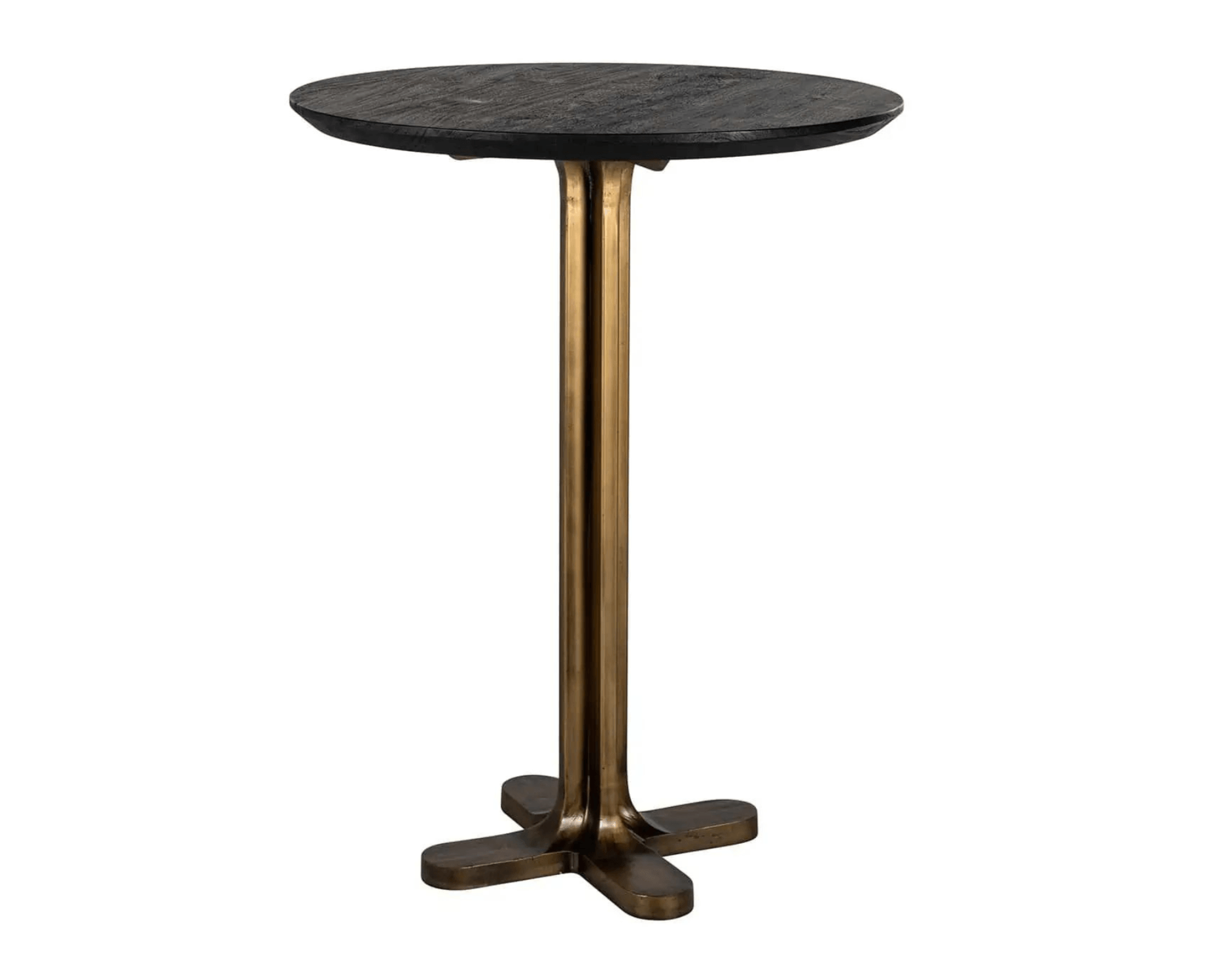 Stół barowy Revelin na mosiężnej podstawie to mebel o wyjątkowej estetyce i funkcjonalności. Jego okrągły blat wykonany z czarnego drewna mangowego nadaje mu niepowtarzalny charakter, tworząc elegancki i stylowy wygląd, który zwraca uwagę w każdym wnętrzu. Metalowa podstawa w kolorze mosiądzu doskonale komponuje się z głębokim odcieniem drewna, tworząc kontrast, który dodaje mu wyrazu. Ta harmonijna kombinacja materiałów sprawia, że stół Revelin nie tylko pełni funkcję praktyczną, ale także stanowi designerski element dekoracyjny.