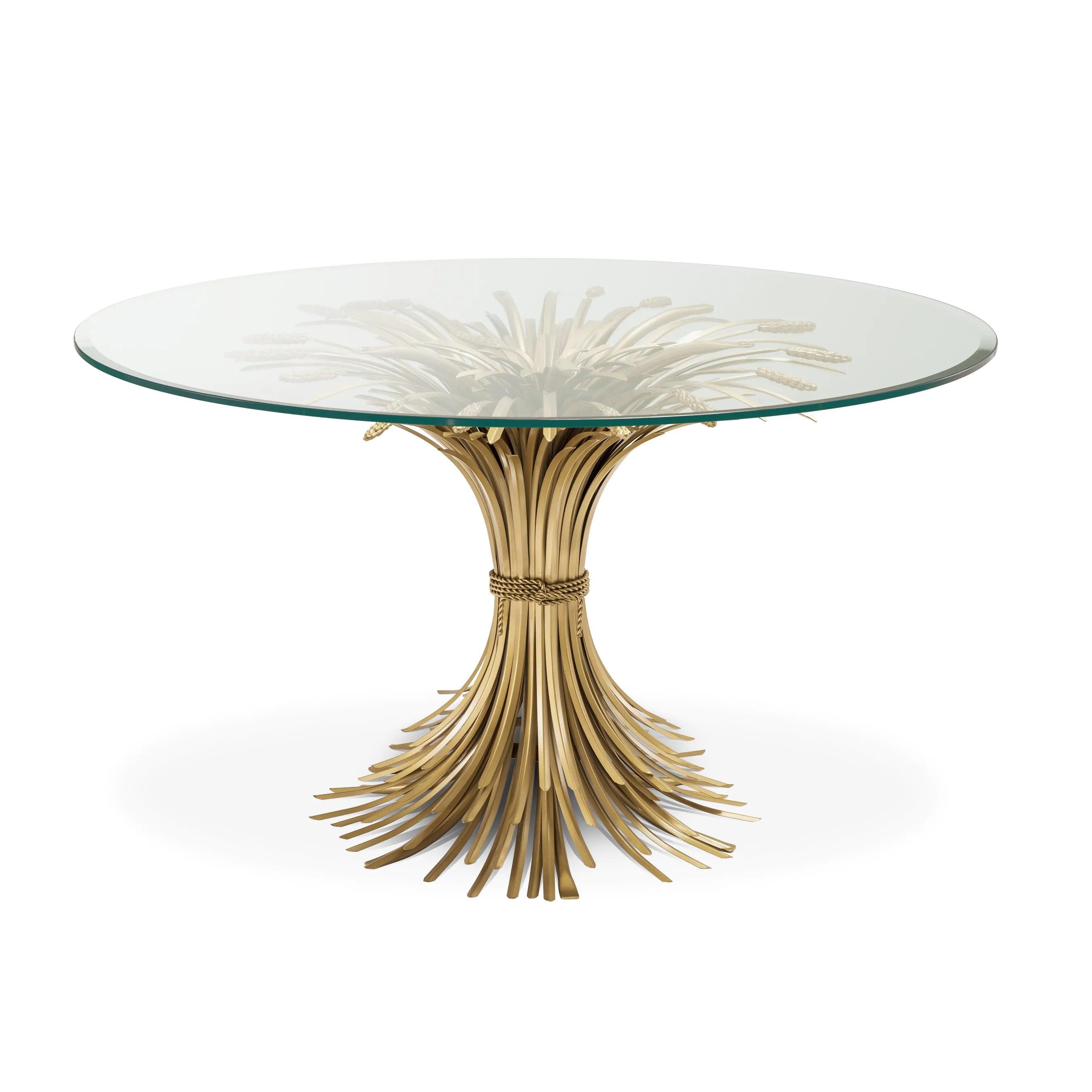 Eettafel Bonheur is de belichaming van elegantie en traditie, verweven in een modern ontwerp. Gemaakt van ijzer met een afwerking in antiek goud, presenteert hij zich op een indrukwekkende en majestueuze manier. De basis, die de vorm heeft van een bundel, trekt niet alleen de aandacht, maar draagt ook een diepere betekenis. De bundel, al eeuwenlang beschouwd als een symbool van welvaart en gastvrijheid, vertelt ons een verhaal over hard werken, opoffering en succes. Het geeft aan dat de persoon die deze tafel gebruikt, geniet van de vruchten van zijn of haar arbeid en bereid is deze te delen met anderen.