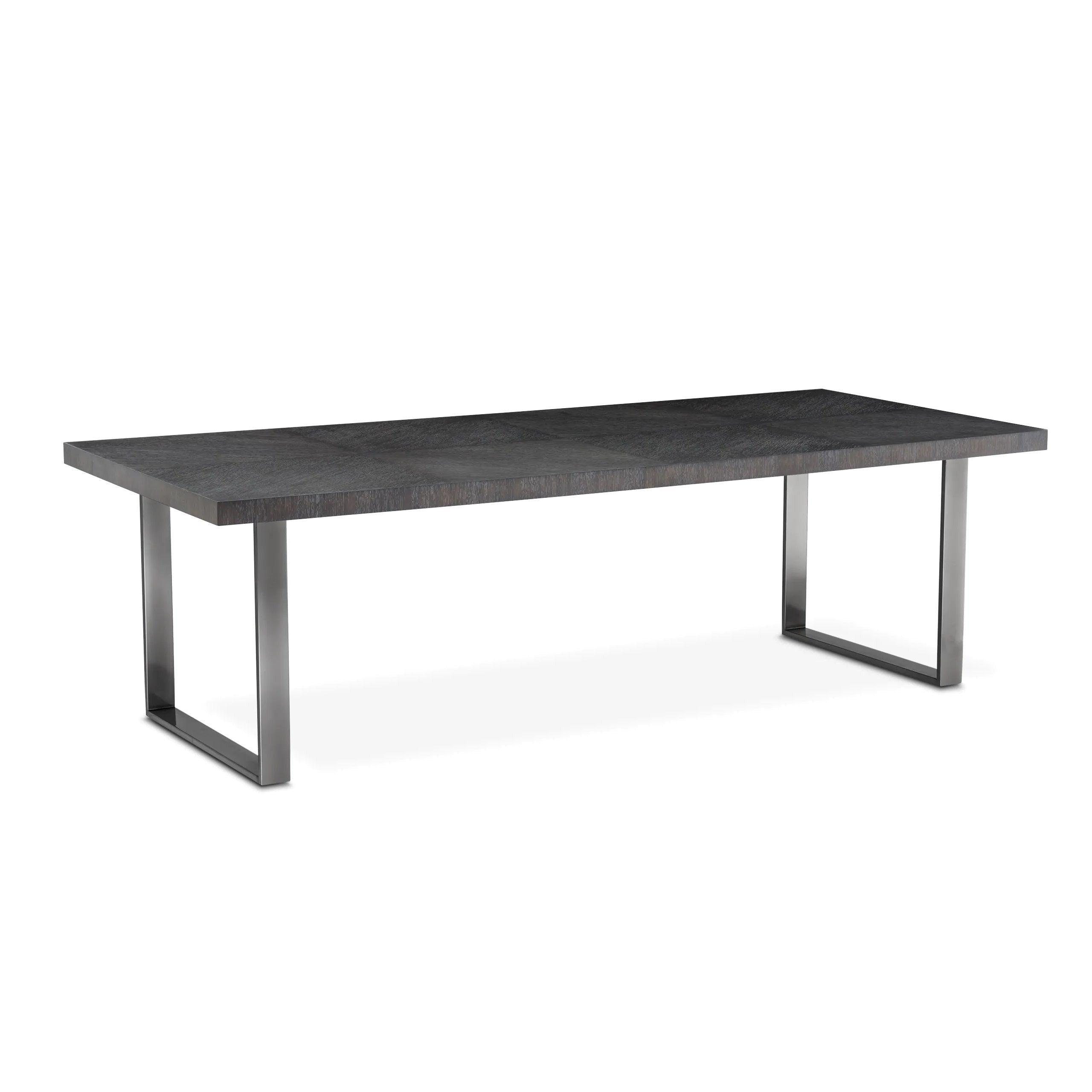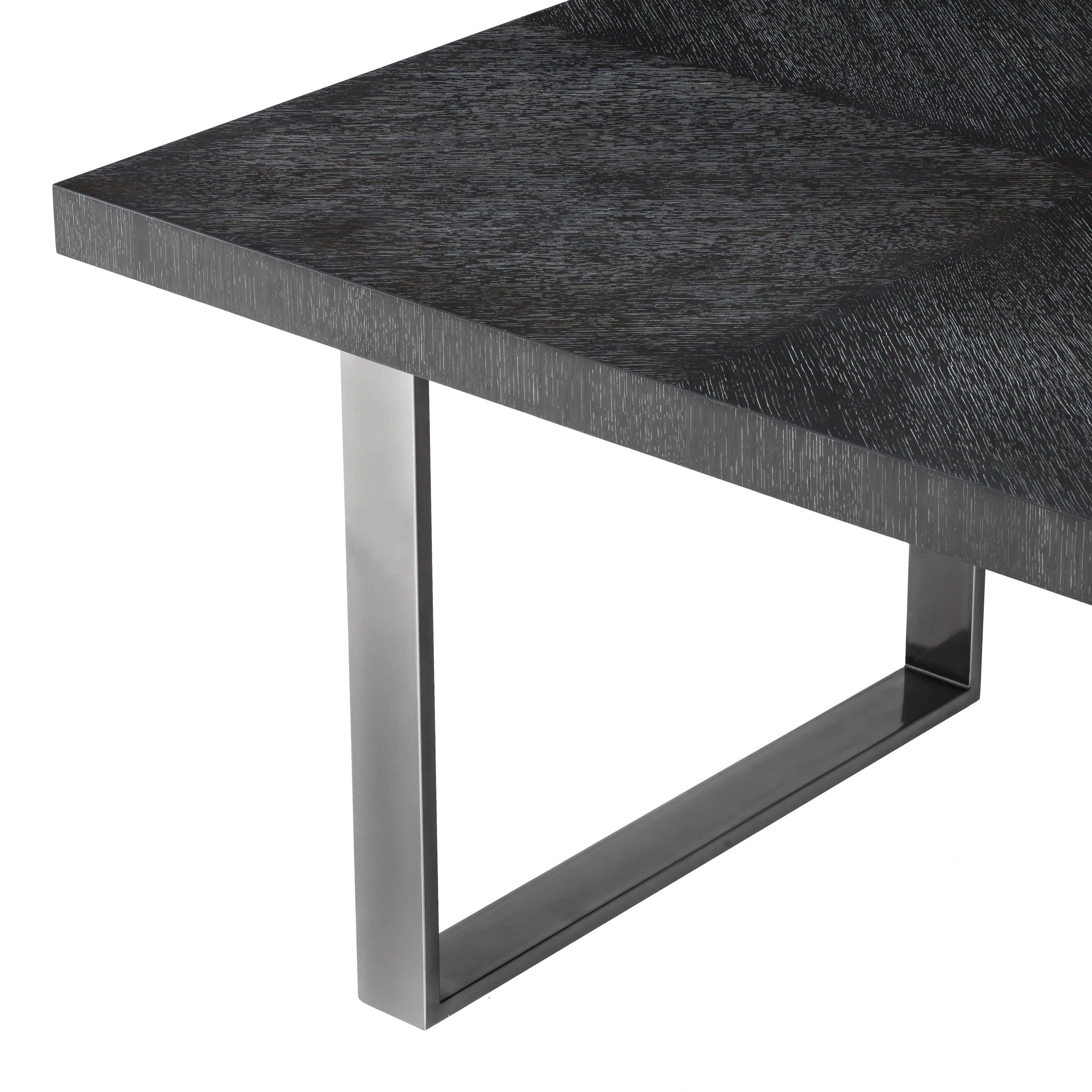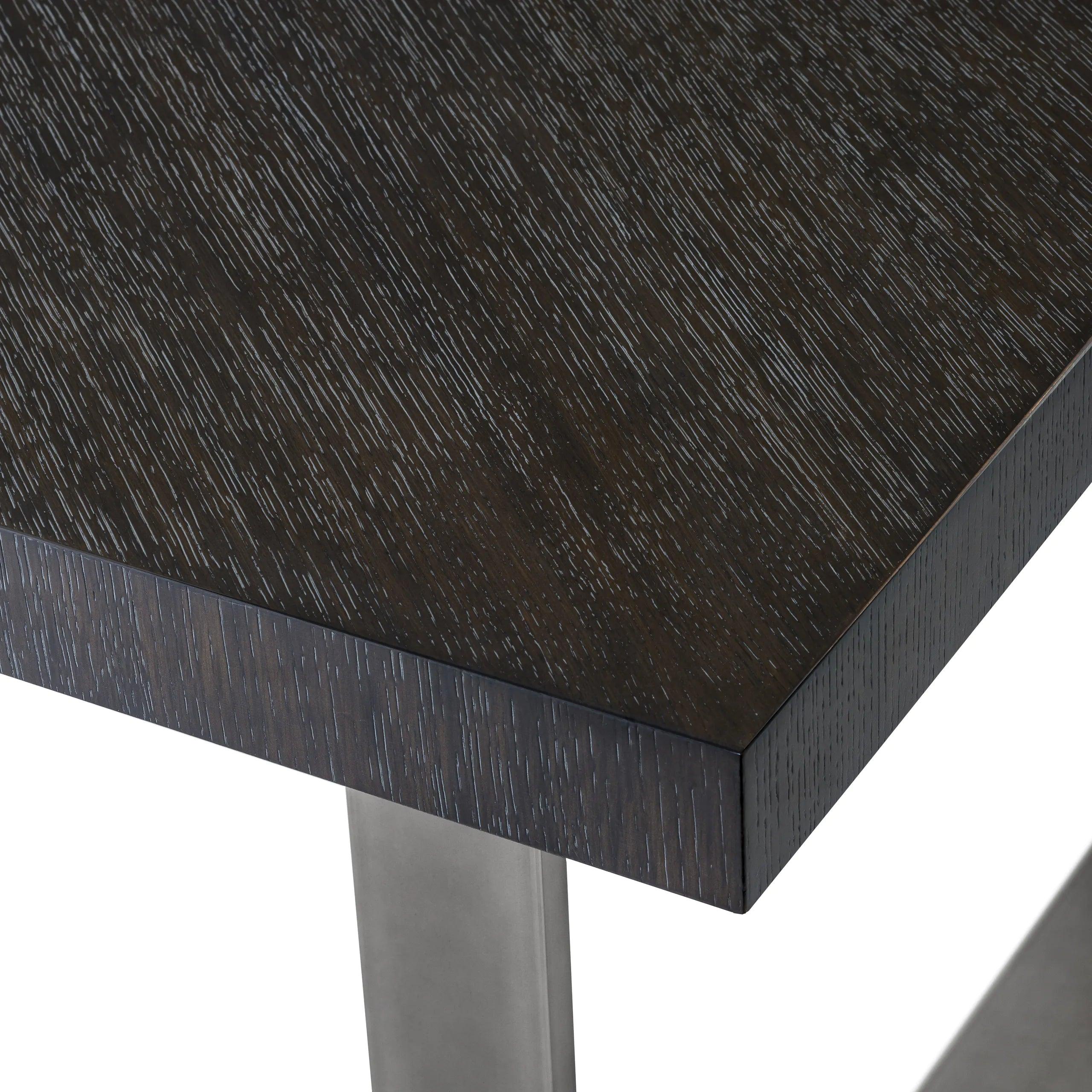 Zodra u de ruimte binnenkomt, zal uw blik onmiddellijk worden getrokken door het metalen frame met een zwarte nikkelafwerking. De minimalistische, maar tegelijkertijd uitgesproken constructie vormt de perfecte achtergrond voor het blad van grafiet eikenfineer. De donkere kleur van het eikenhout geeft de tafel karakter, terwijl het de ruwe esthetiek benadrukt.