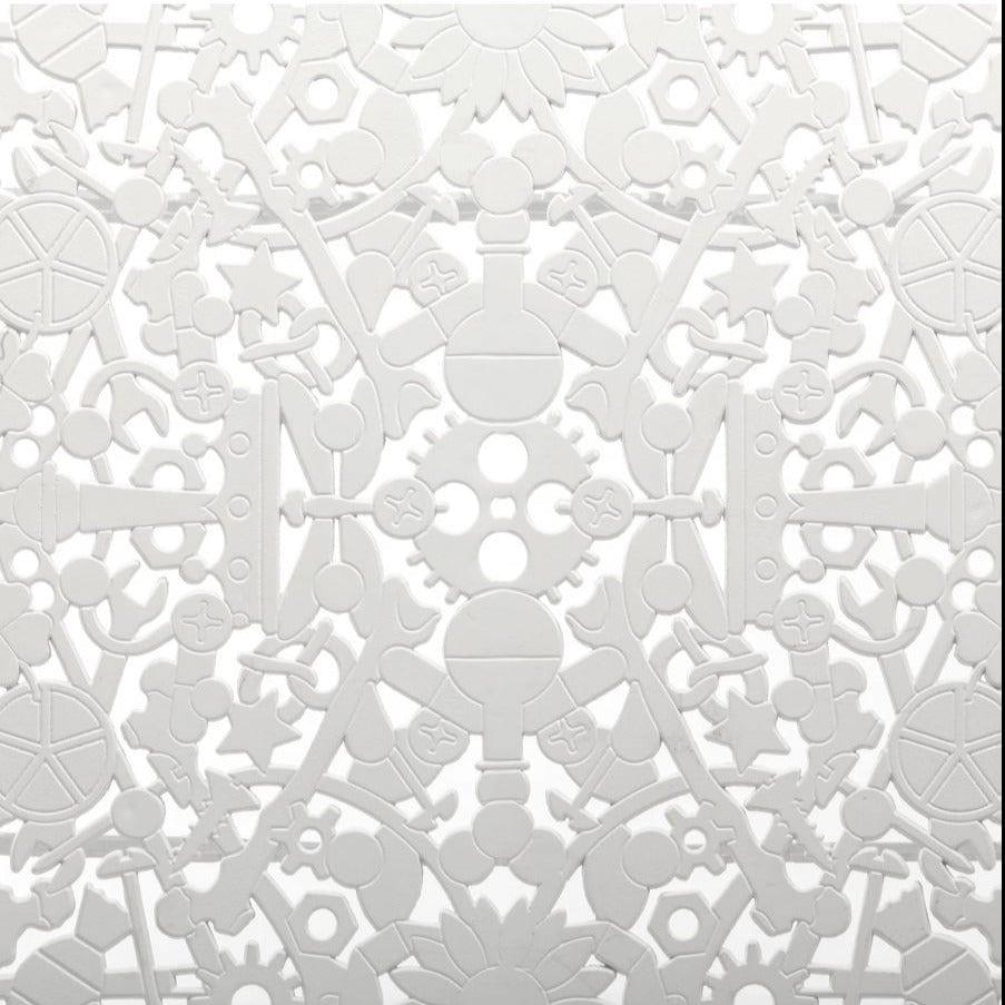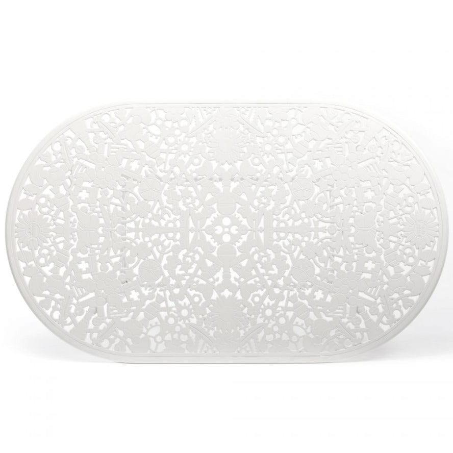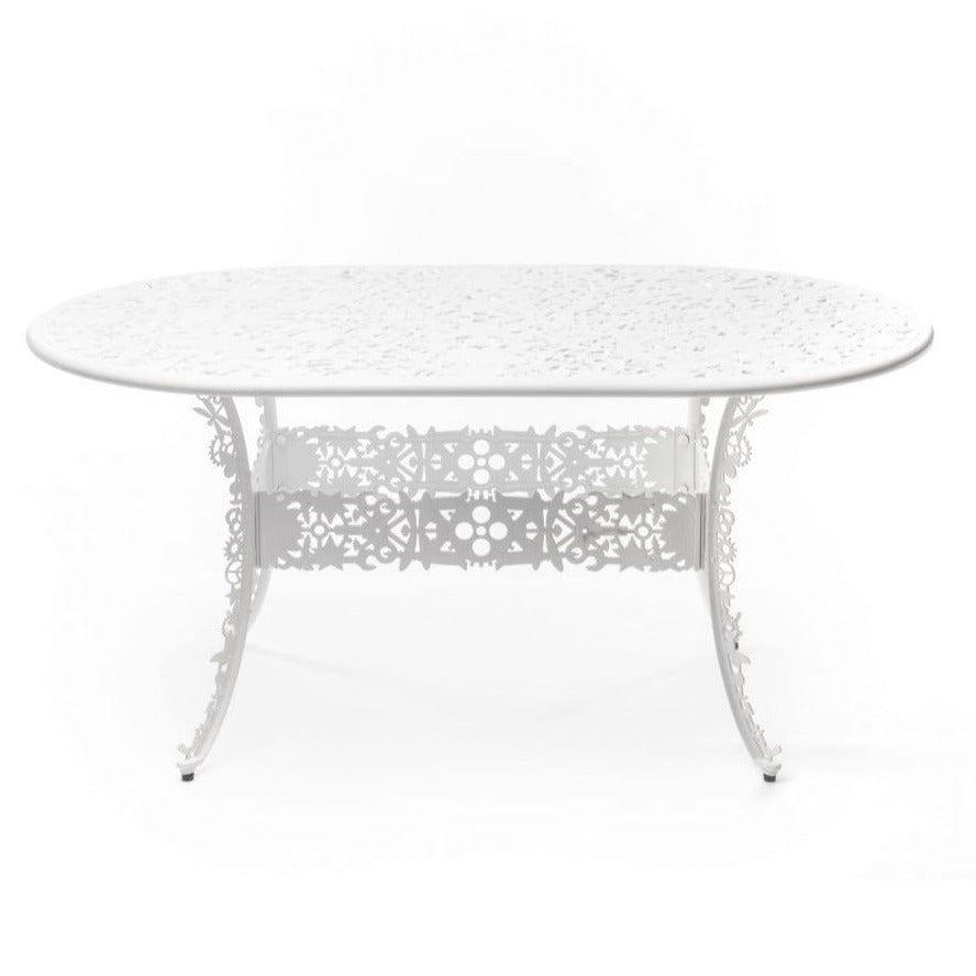 Een unieke tuin tafel in Victoriaanse stijl, maar dan in een nieuw, avant-gardistisch jasje, is een creatie van het Italiaanse merk Seletti. De rugleuning en zitting verbergen talloze, ongebruikelijke patronen, zoals tandwielen en bloemen, wat het geheel een onmiskenbaar karakter geeft.