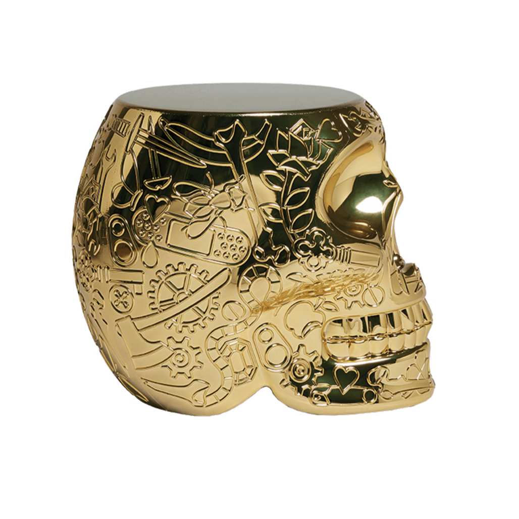 Designer kruk Mexico, ontworpen door Studio Job, is een ontwerp in de vorm van een schedel met een grafisch patroon op het oppervlak, dat zowel als kruk als bijzettafel fungeert. Dit ontwerp is geïnspireerd op het feest van de doden — Día de los Muertos, dat uitbundig wordt gevierd in Mexico. Dit kleurrijke en muzikale evenement heeft een buitengewoon vrolijk karakter, wat de makers hebben geprobeerd vast te leggen in het ontwerp.