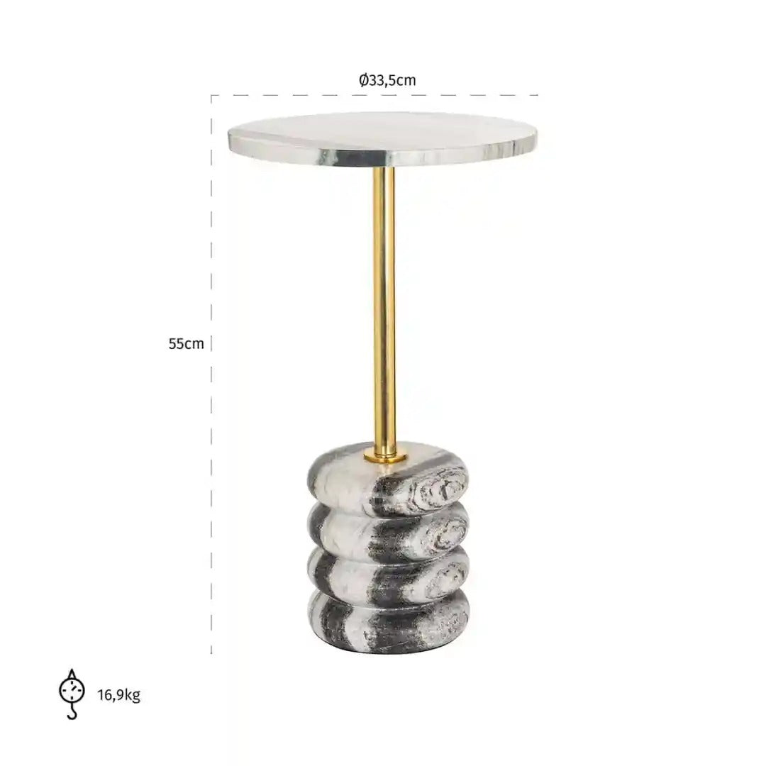 Elegante bijzettafel Isolde combineert de edelheid van marmer met de moderne uitstraling van aluminium. Het ronde blad van 1,5 cm dik, samen met het slanke, gouden onderstel, geeft een bijzonder lichte indruk, terwijl de decoratieve basis van marmer het geheel een unieke uitstraling verleent. Dit meubelstuk is een opvallende aanvulling in de woonkamer, slaapkamer of kantoor, en kan dienen als hulp of decoratieve tafel.