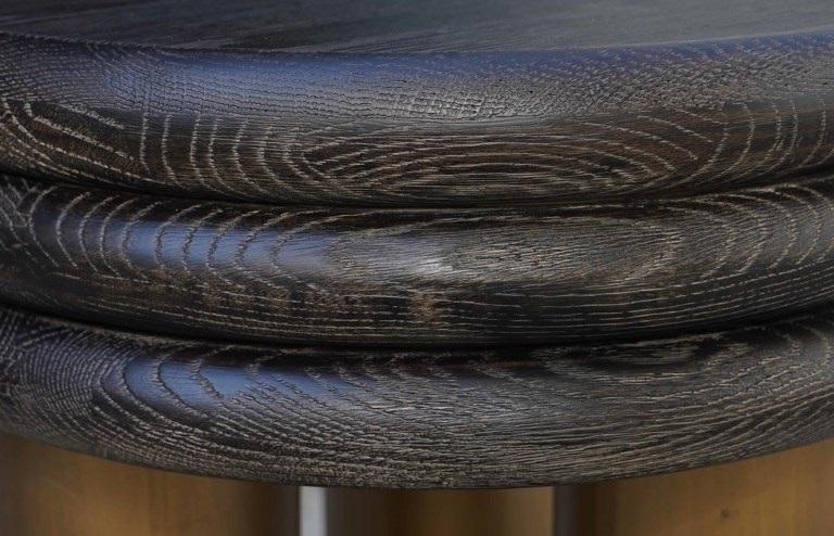 Het bijzondere ontwerp van de Macaron tafel combineert een perfecte balans tussen de natuurlijkheid van hout en de moderniteit van metaal. Het eikenhouten blad brengt warmte en authenticiteit in de ruimte, waarbij het natuurlijke karakter van het materiaal wordt benadrukt. De metalen basis in de kleur van messing voegt een element van luxe en uitzonderlijke verfijning toe.