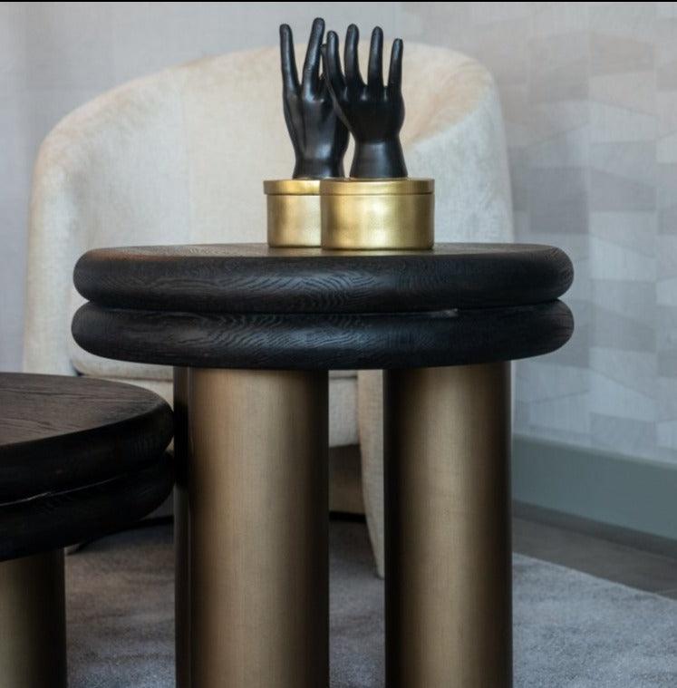 Bijzettafel Macaron in de combinatie van zwart en messing is een voorstel met een uitzonderlijke charme en elegantie. Het blad is vervaardigd uit de hoogste kwaliteit eikenhout, terwijl de basis van metaal is, die zich presenteert in een opvallende kleur van geborsteld goud. Deze unieke combinatie van kleuren en materialen geeft deze bijzettafel een chique uitstraling en een hedendaags karakter.
