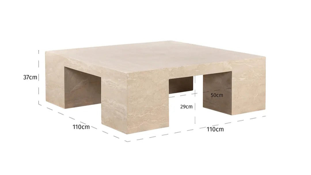 Moderne salontafel Biltmore met een vierkant blad is een combinatie van de ruwe schoonheid van steen en een industriële afwerking van ijzer. Het blad van natuurlijk travertijn betovert met zijn unieke tekening en edele structuur, terwijl de massieve basis van ijzer stabiliteit en een kenmerkende, minimalistische uitstraling biedt. Dit is een meubelstuk dat luxe in uw interieur brengt, terwijl het de eenvoud van de vorm behoudt.