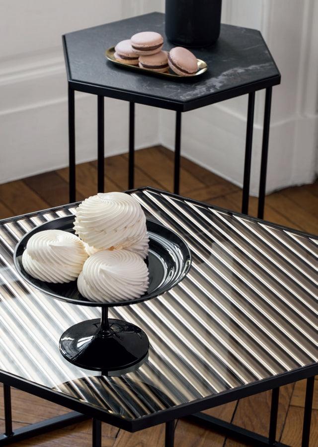Renee biedt een diverse collectie koffietafels en bijzettafels in verschillende geometrische vormen, maten en hoogtes. Kies tussen zeshoekige en vierkante bladen, beschikbaar in verbluffend spiegelend glas met een opvallend golfeffect of elegante keramische afwerkingen.