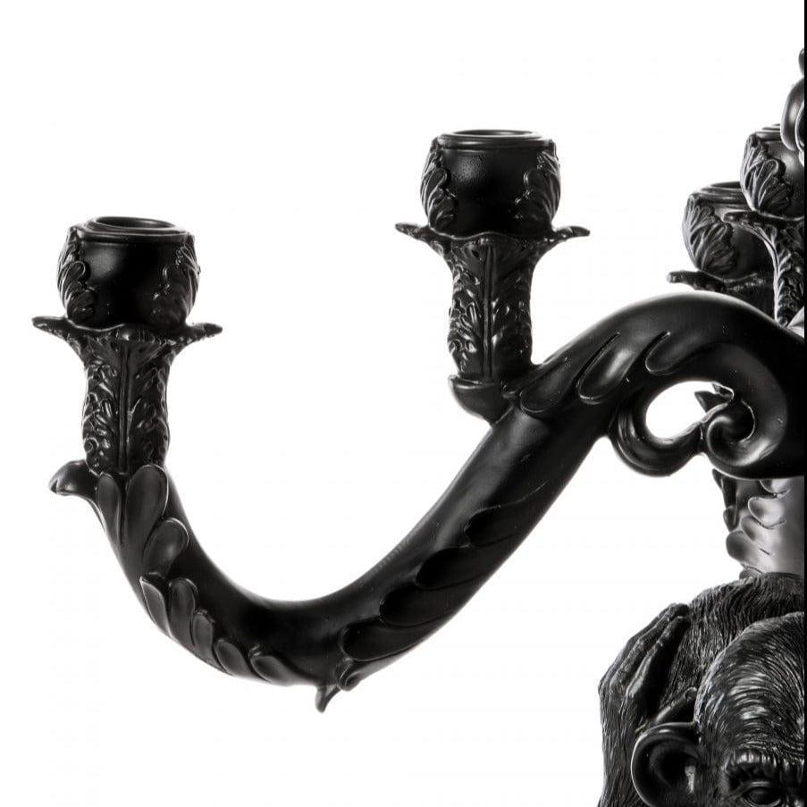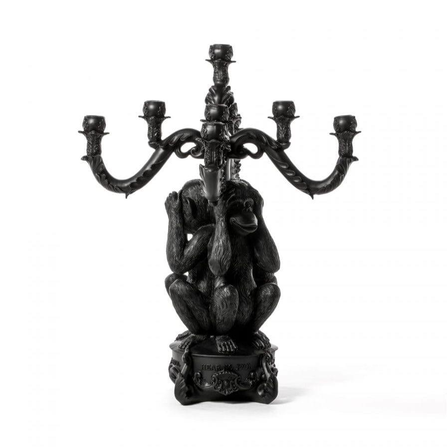 De 3 Monkeys kaarsenhouder biedt eclectische stijl voor een onverwacht diner bij kaarslicht. Het is een voorstel dat avant-gardistische benaderingen combineert met barokke grotesken.