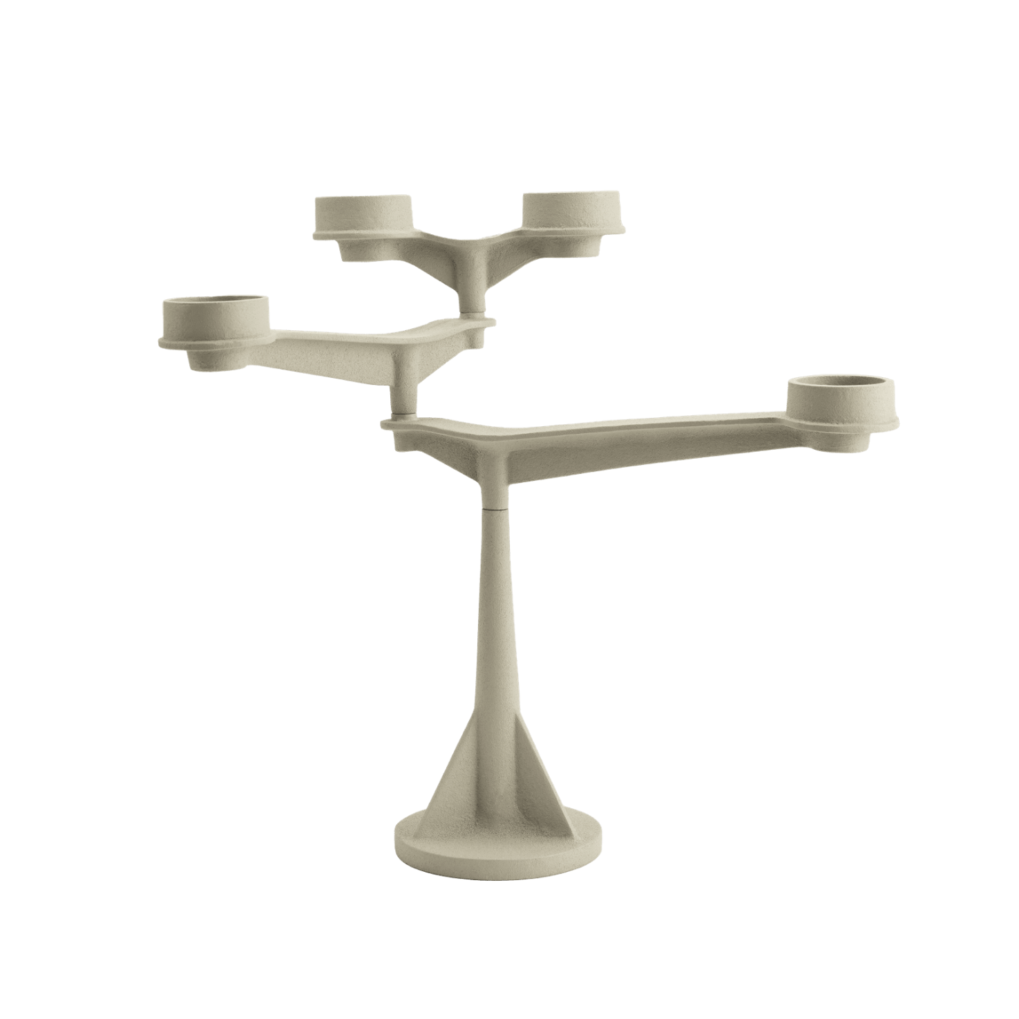 De constructie, gemaakt van gietijzer, is geïnspireerd op de massieve mechanismen van havenkranen en de mechanische elegantie van mobiles uit de jaren '50. Deze moderne kaarsenhouder toont met evenveel finesse zowel tealights als klassieke kegelvormige kaarsen, waarbij gebruiksfunctie wordt gecombineerd met artistieke expressie. De design kaarsenhouder Spin is perfect als een opvallend middelpunt op de tafel in de eetkamer, woonkamer of representatieve ruimte, waar design een sleutelrol speelt.