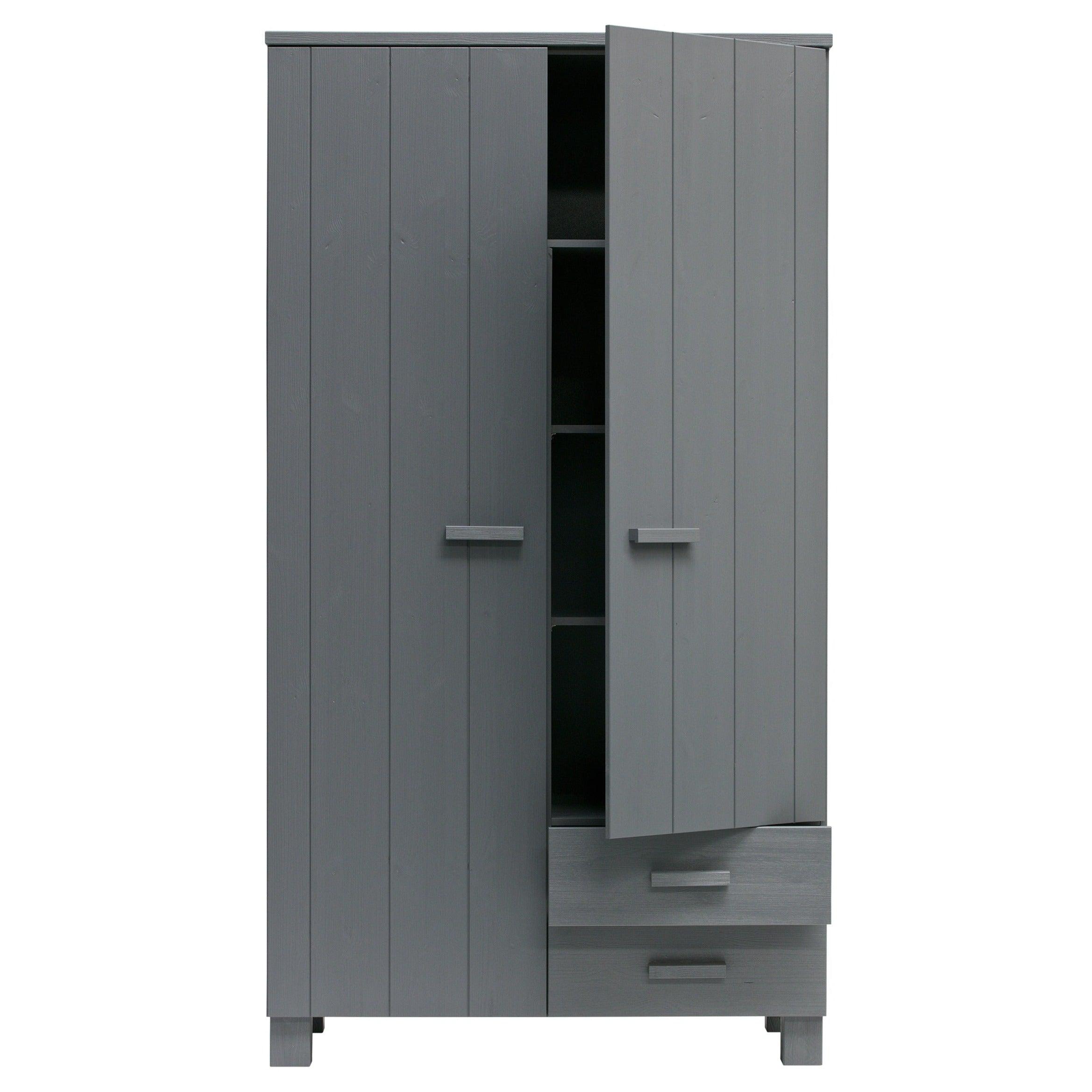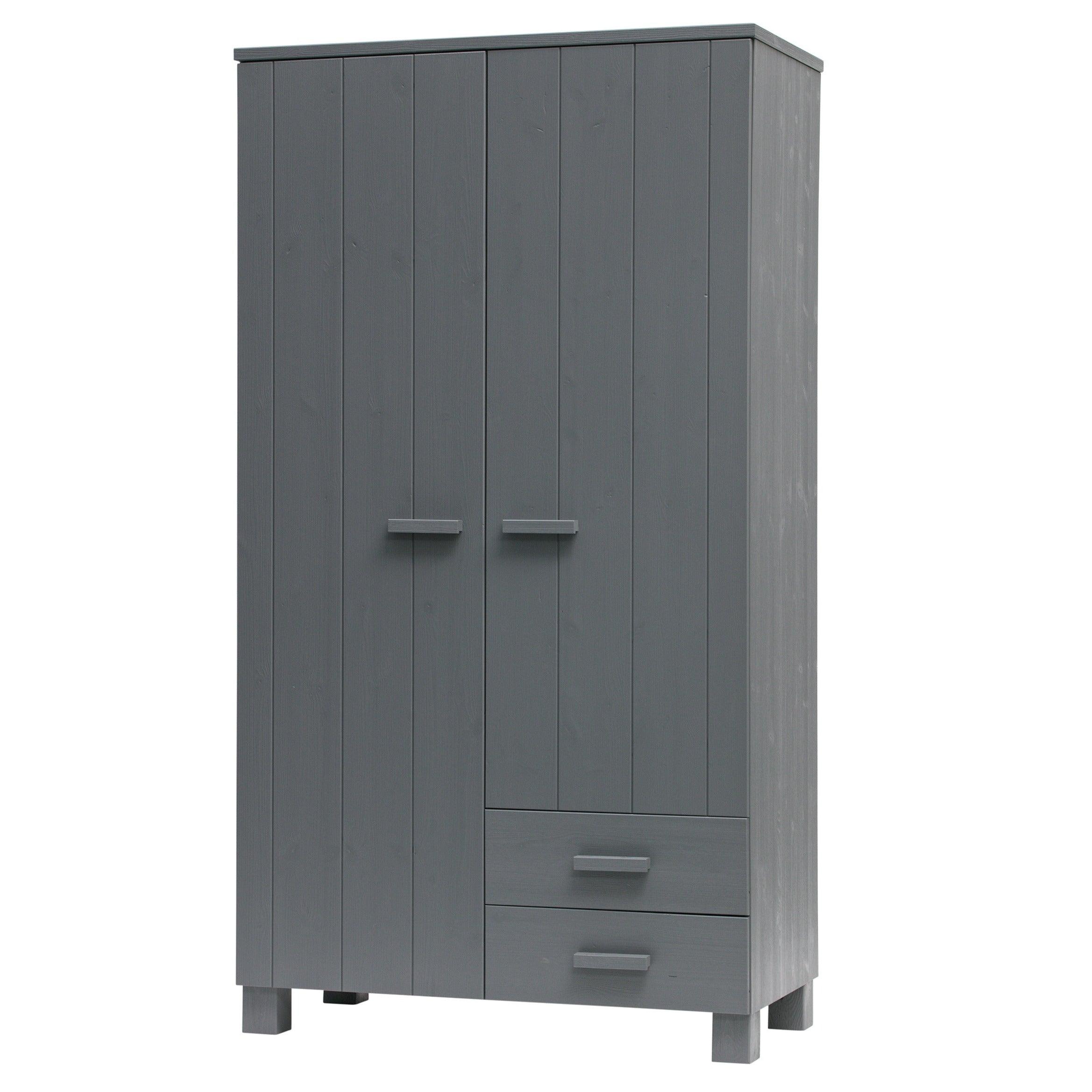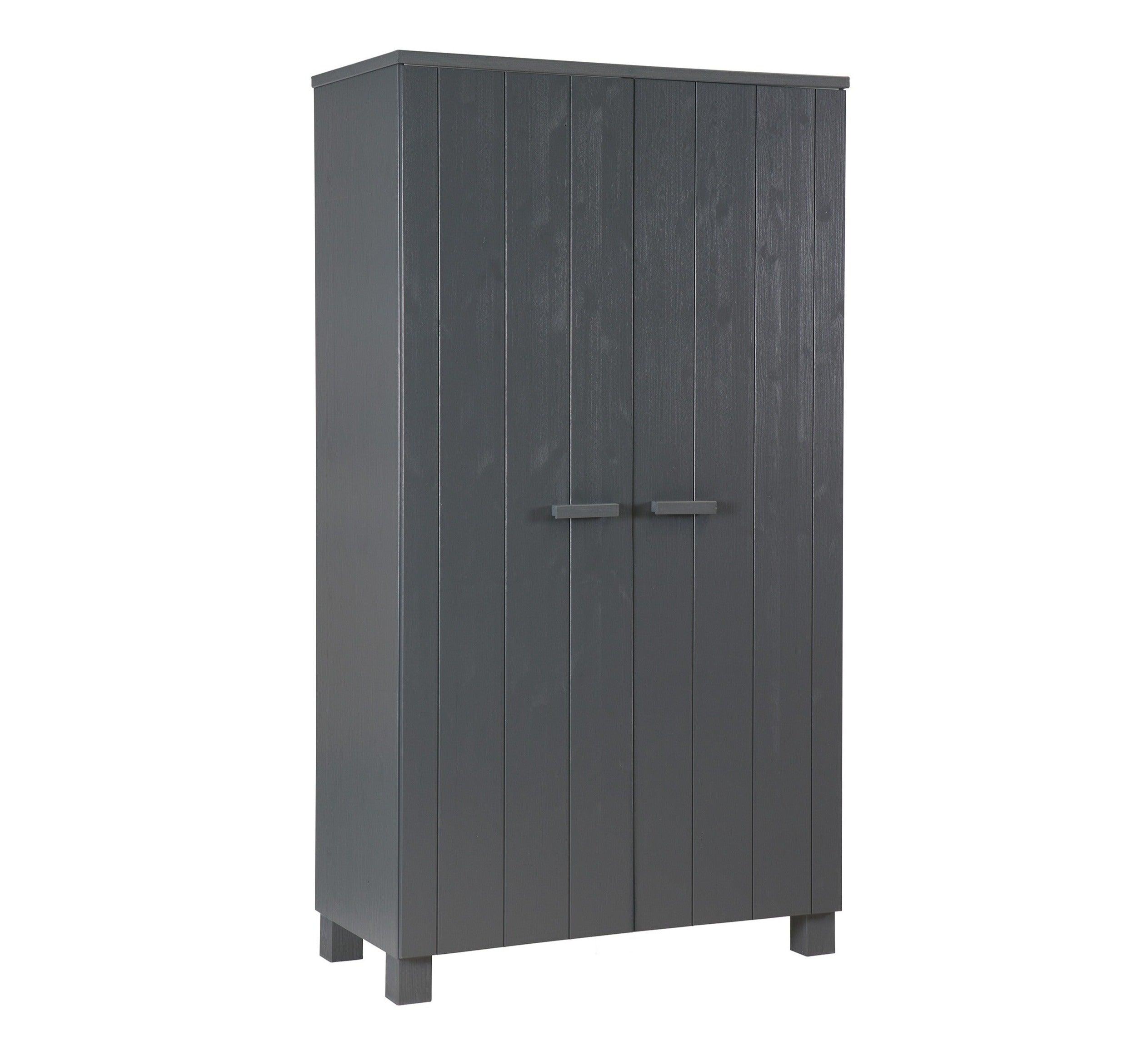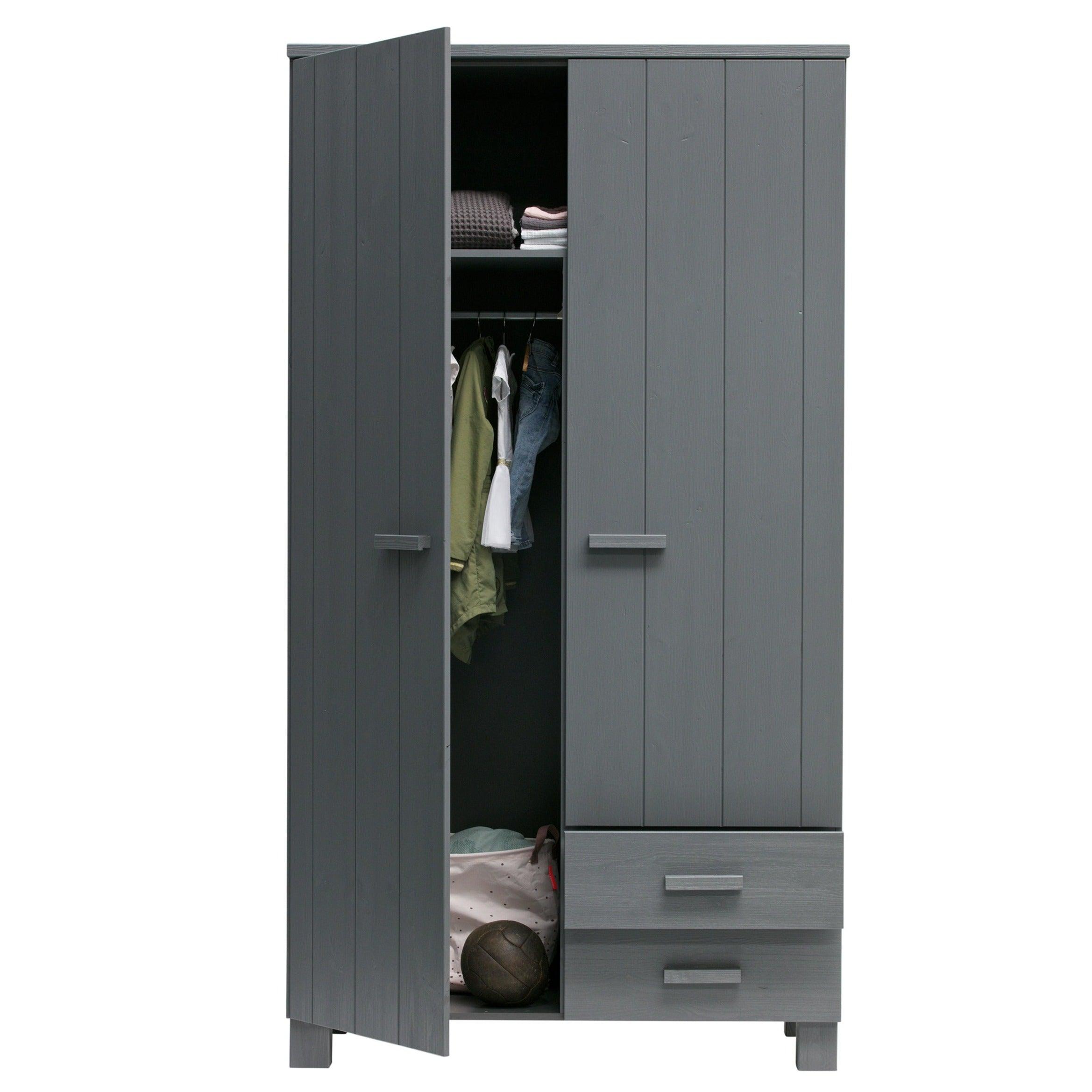 Grafieten kast Dennis is gemaakt van vurenhout, wat zorgt voor duurzaamheid en levensduur. De twee deuren openen gemakkelijk en onthullen een opbergruimte die groot genoeg is om alles op te bergen wat u nodig heeft - van kleding tot beddengoed of handdoeken. Bovendien kan de kast worden uitgerust met twee praktische lades, die een nog betere organisatie en opslag van kleine voorwerpen mogelijk maken.