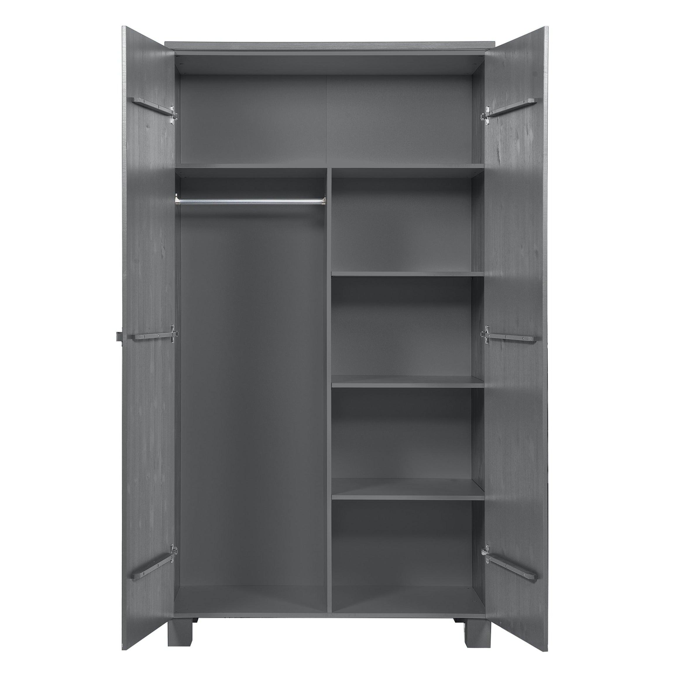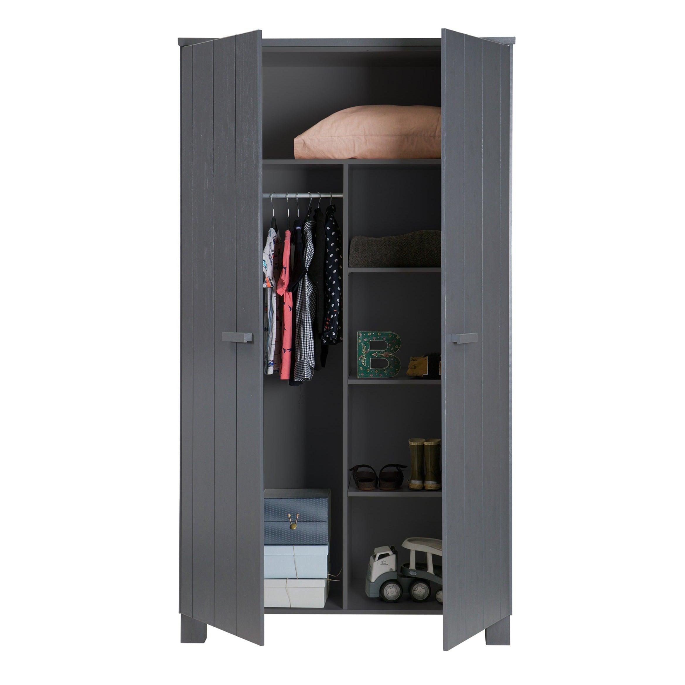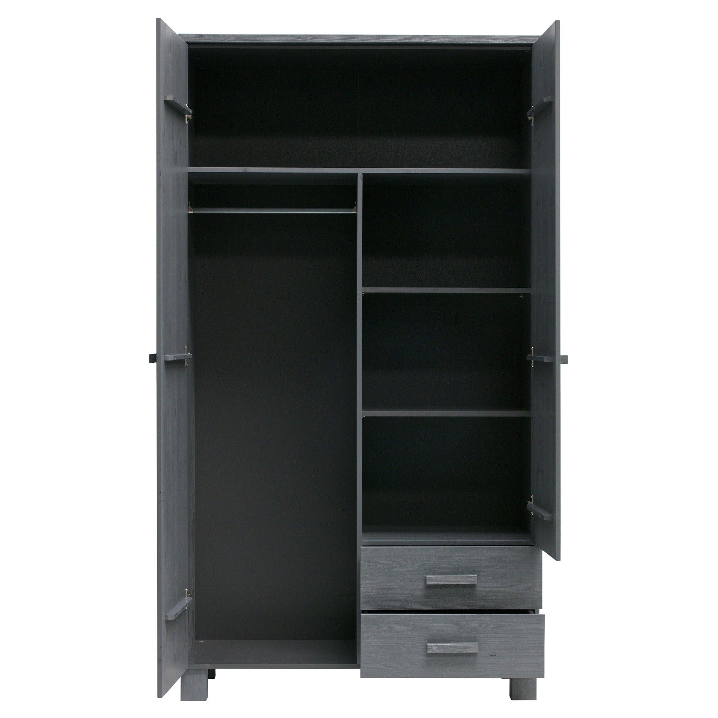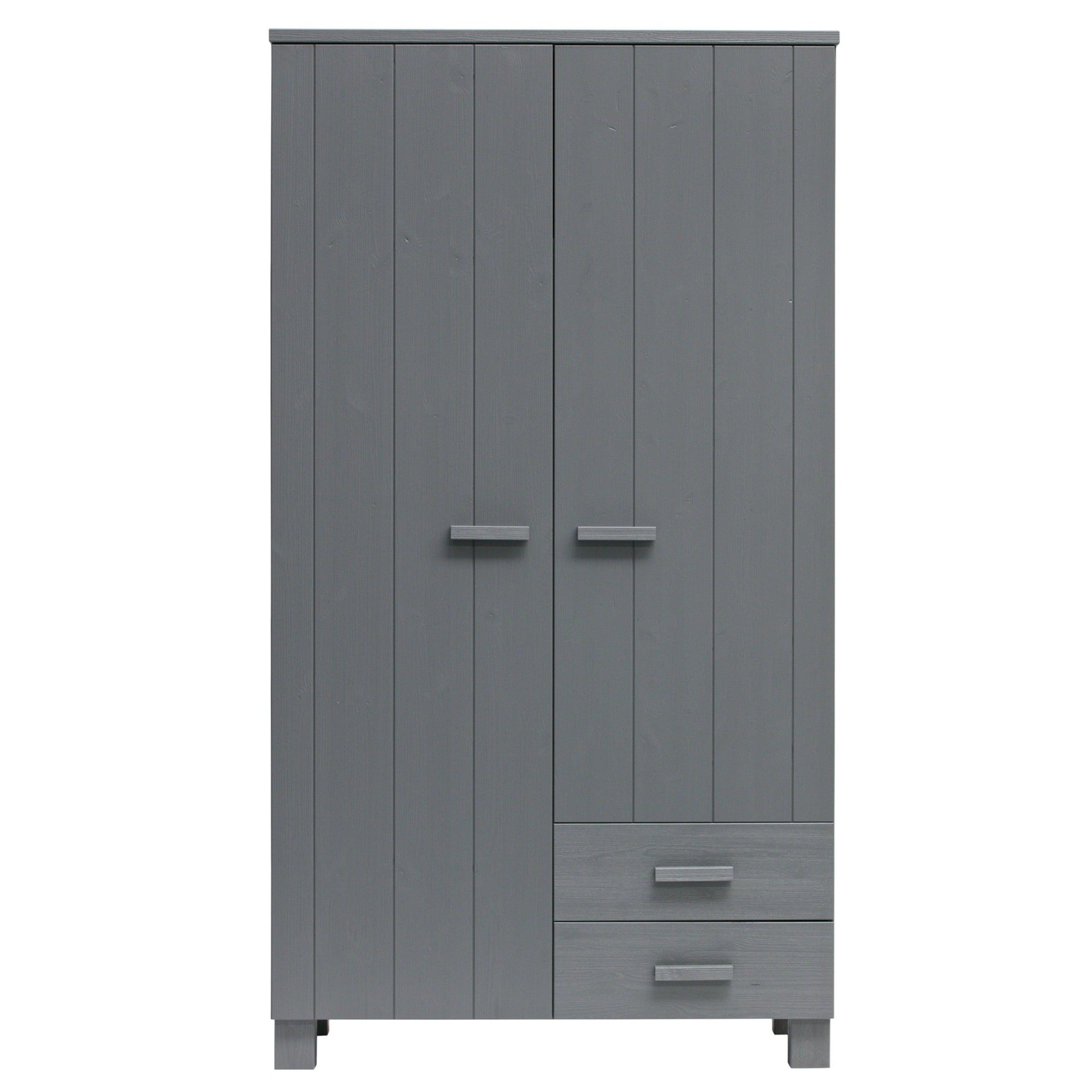 Grafieten kast Dennis is gemaakt van vurenhout, wat zorgt voor duurzaamheid en levensduur. De twee deuren openen gemakkelijk en onthullen een opbergruimte die groot genoeg is om alles op te bergen wat u nodig heeft - van kleding tot beddengoed of handdoeken. Bovendien kan de kast worden uitgerust met twee praktische lades, die een nog betere organisatie en opslag van kleine voorwerpen mogelijk maken.