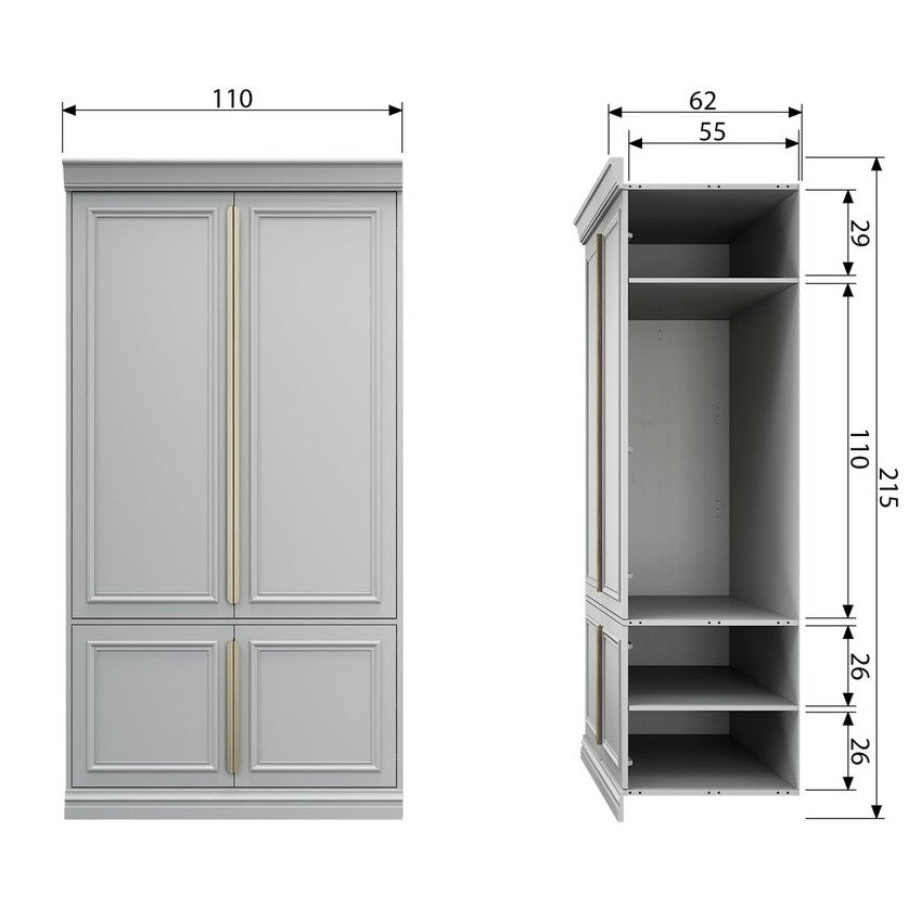 Kast met hangroede Organize is een solide, klassieke meubelstuk in een moderne uitvoering, perfect voor stijlvolle en functionele interieurs. De combinatie van decoratieve frezen op de fronten met elegante handgrepen in roségoud en een afwerking in mistgrijs geeft het geheel een unieke uitstraling. De ruime binnenkant van de kast biedt volop opbergruimte voor zowel hangende als opgevouwen kleding.