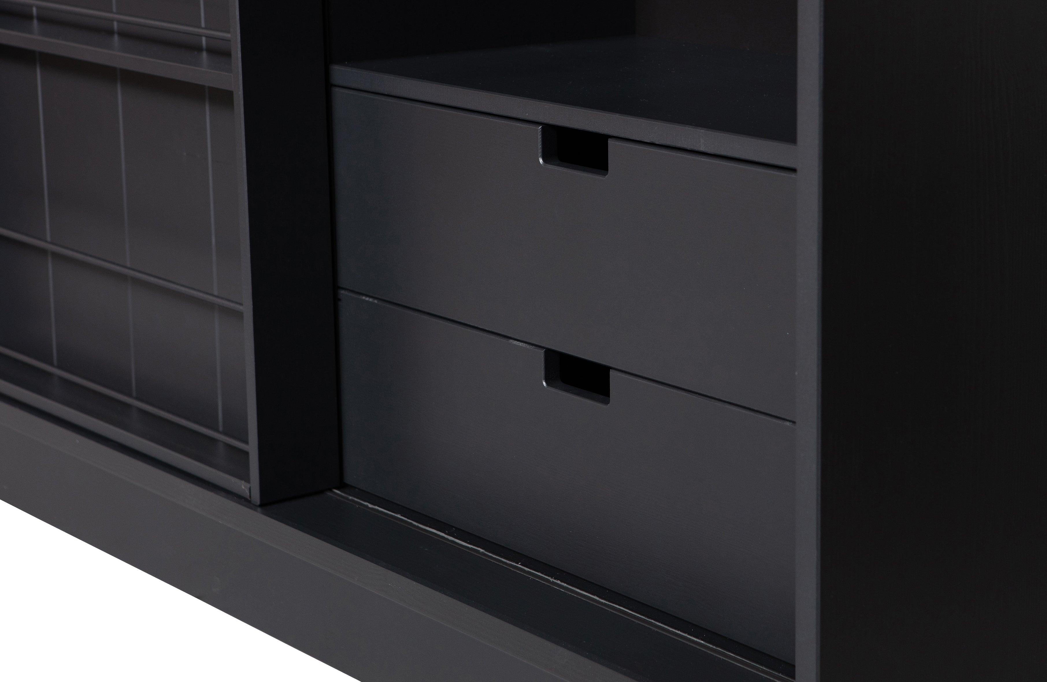 Czarna szafa Swing jest wykonana z wytrzymałych materiałów, które zapewniają jej długowieczność i trwałość. Drzwi przesuwne zostały zaprojektowane tak, aby można było dodać własne dodatki takie jak np. zdjęcia, które nadadzą niezwykłego charakteru. Przestrzeń do przechowywania, jest na tyle pojemna, aby pomieścić wszystko, czego potrzebujesz - od ubrań po pościel czy ręczniki. Dodatkowo, szafa wyposażona jest w dwie praktyczne szuflady, które umożliwiają jeszcze lepszą organizację i przechowywanie drobnych przedmiotów.