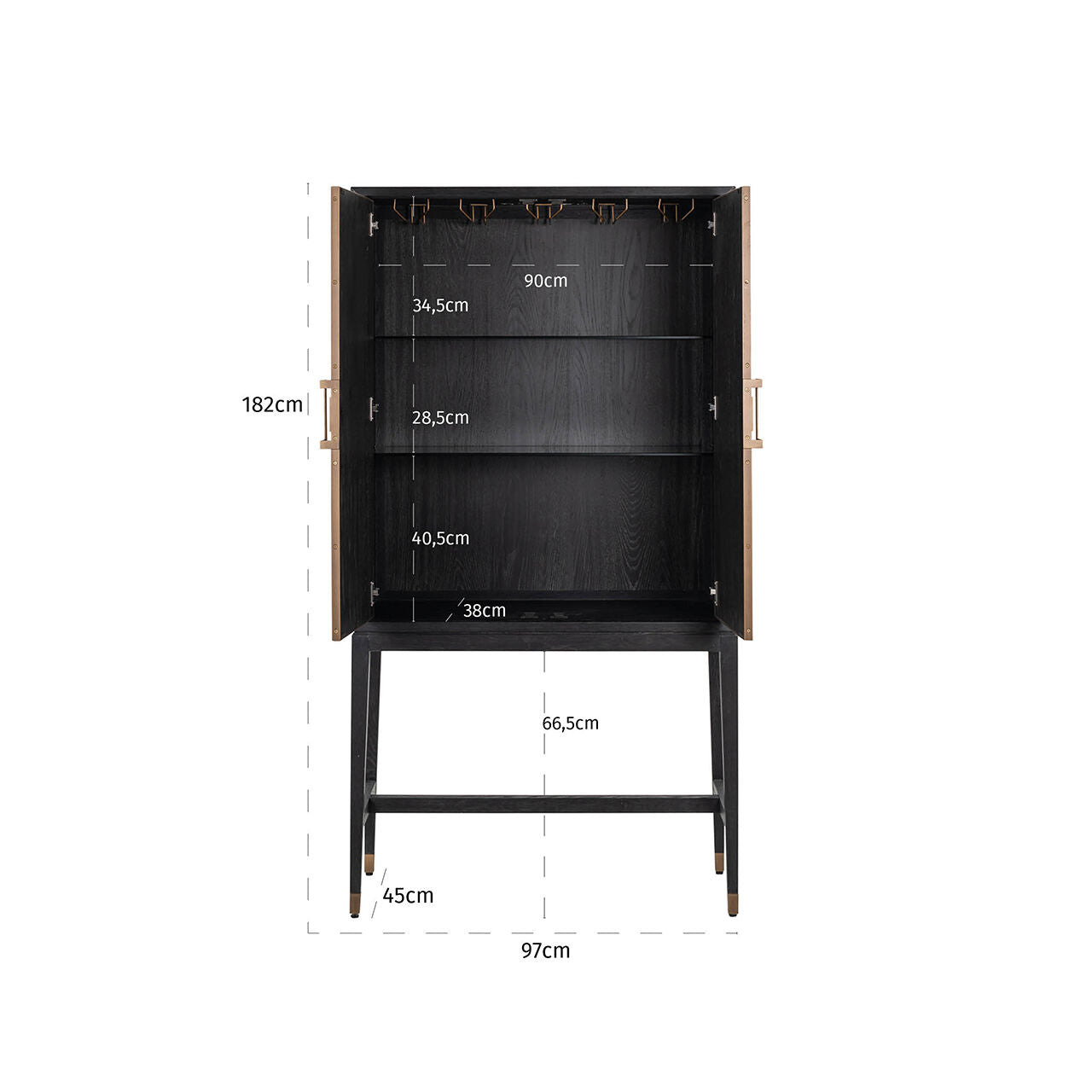 De ingebouwde glazenhouders maken dit barmeubel multifunctioneel, ideaal voor gebruik in de keuken, eetkamer of woonkamer. Het is een perfecte plek om verschillende accessoires voor het bereiden en serveren van dranken op te bergen. De matte gouden metalen details voegen subtiele, luxueuze accenten toe aan het meubel, die zijn uniciteit benadrukken.