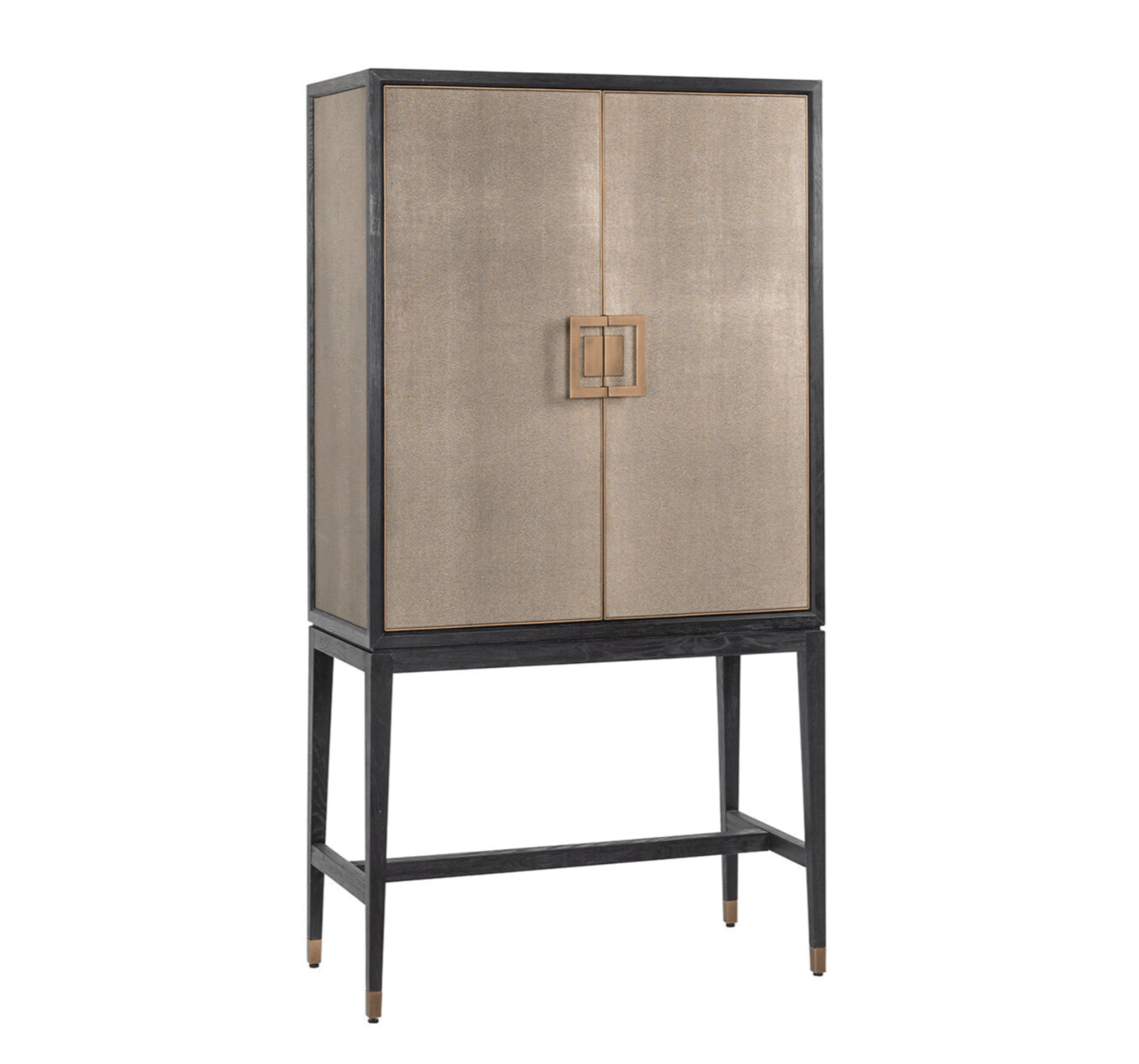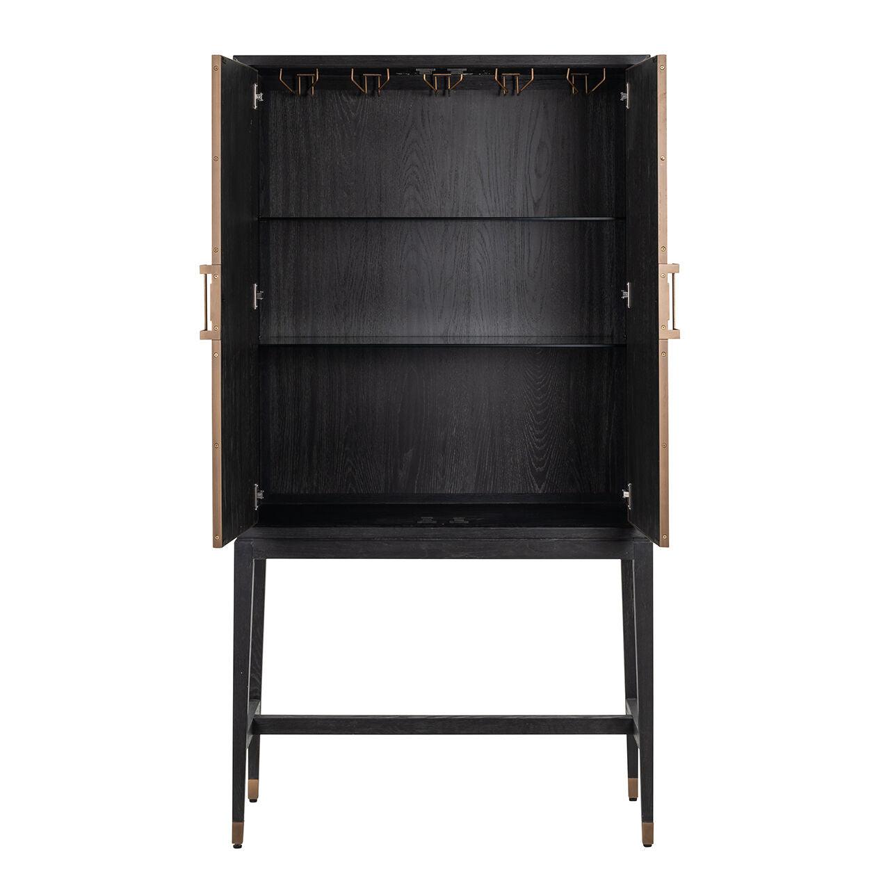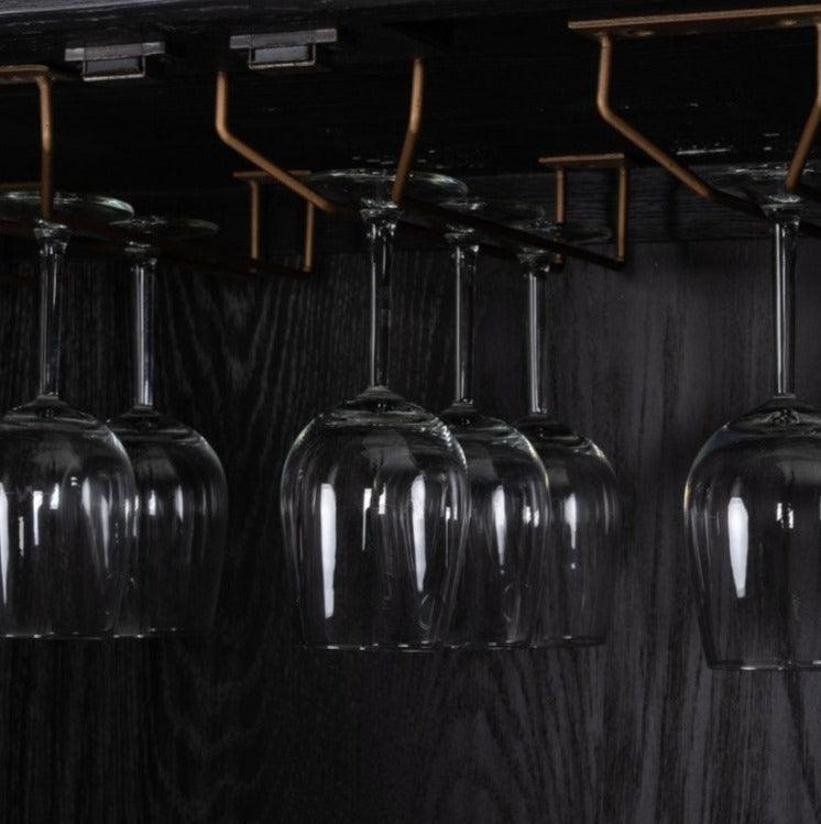 Wbudowane wieszaki na kieliszki sprawiają, że ta szafka barowa jest produktem wielofunkcyjnym, idealnym do wykorzystania w kuchni, jadalni czy salonie. To doskonałe miejsce do przechowywania różnego rodzaju akcesoriów związanych z przygotowywaniem i serwowaniem napojów. Matowe złote metalowe detale dodają meblowi subtelnych, luksusowych akcentów, które podkreślają jego wyjątkowość.