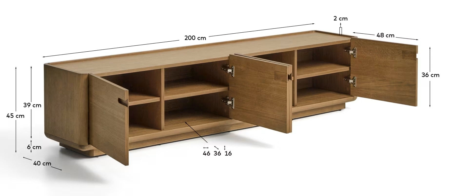 Vier deuren met een stille sluiting bieden comfortabele opslag voor AV-apparatuur en accessoires, terwijl de verstelbare poten een perfecte aanpassing aan de ondergrond mogelijk maken. Lokale productie in Europa en het gebruik van gecertificeerd FSC-hout garanderen een verantwoordelijke benadering van het milieu. Dit stijlvolle TV-meubel voor de woonkamer combineert esthetiek, duurzaamheid en dagelijkse functionaliteit.