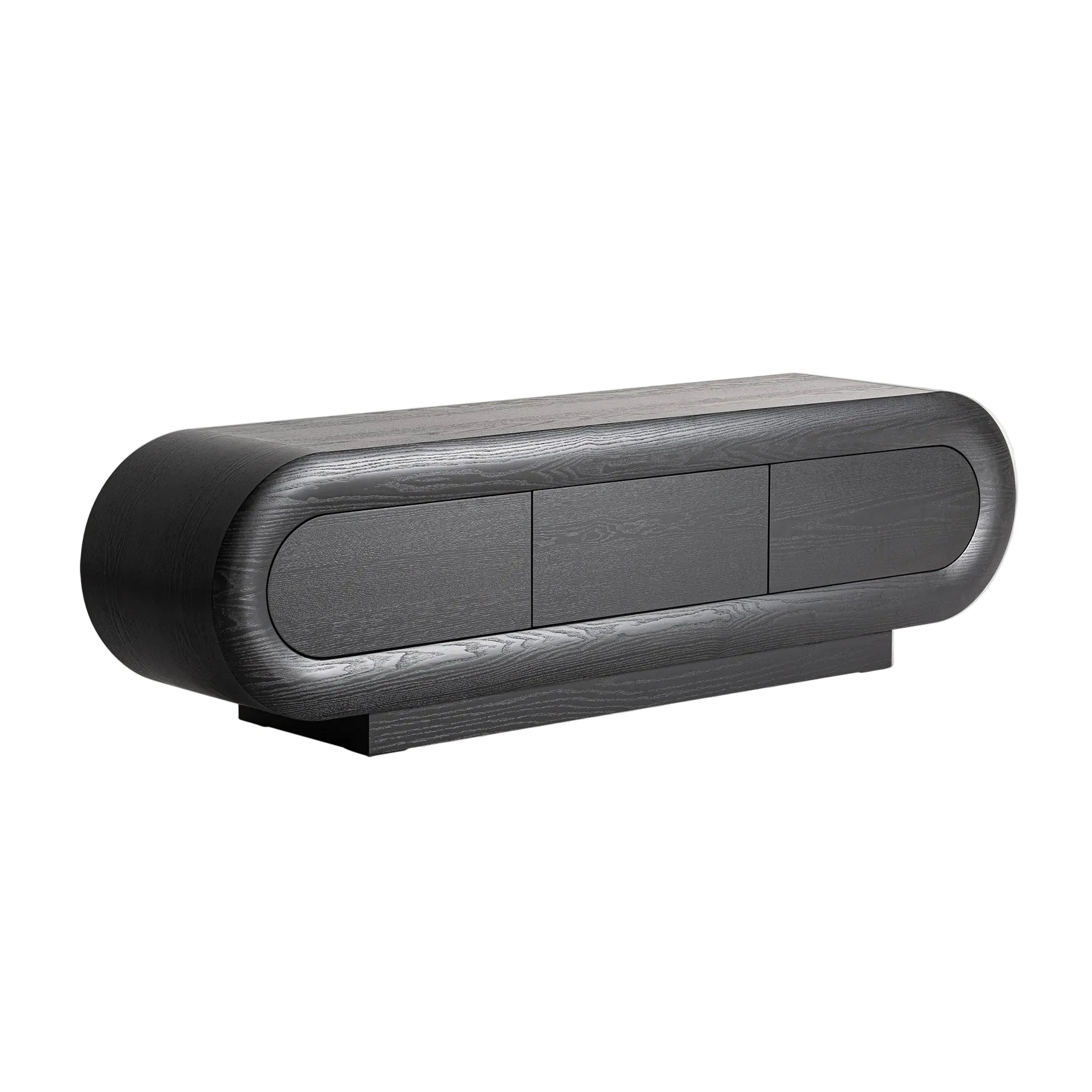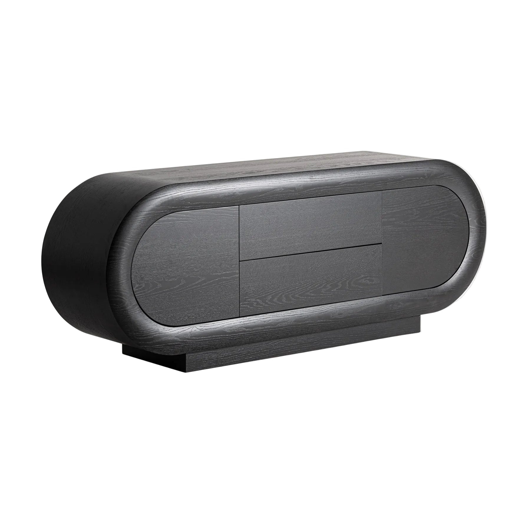 TV-meubel Chamonix is een modern en elegant meubel dat minimalistische vormen combineert met een uitgesproken karakter. Gemaakt van eikenhout in een diepe, zwarte afwerking, valt het op door de harmonieuze combinatie van afgeronde en horizontale lijnen, die het een gevoel van lichtheid en visuele samenhang geven. Dit stijlvolle TV-meubel voor de woonkamer is perfect als centraal element in de ontspanningsruimte, met ruimte voor multimedia-apparatuur en accessoires.