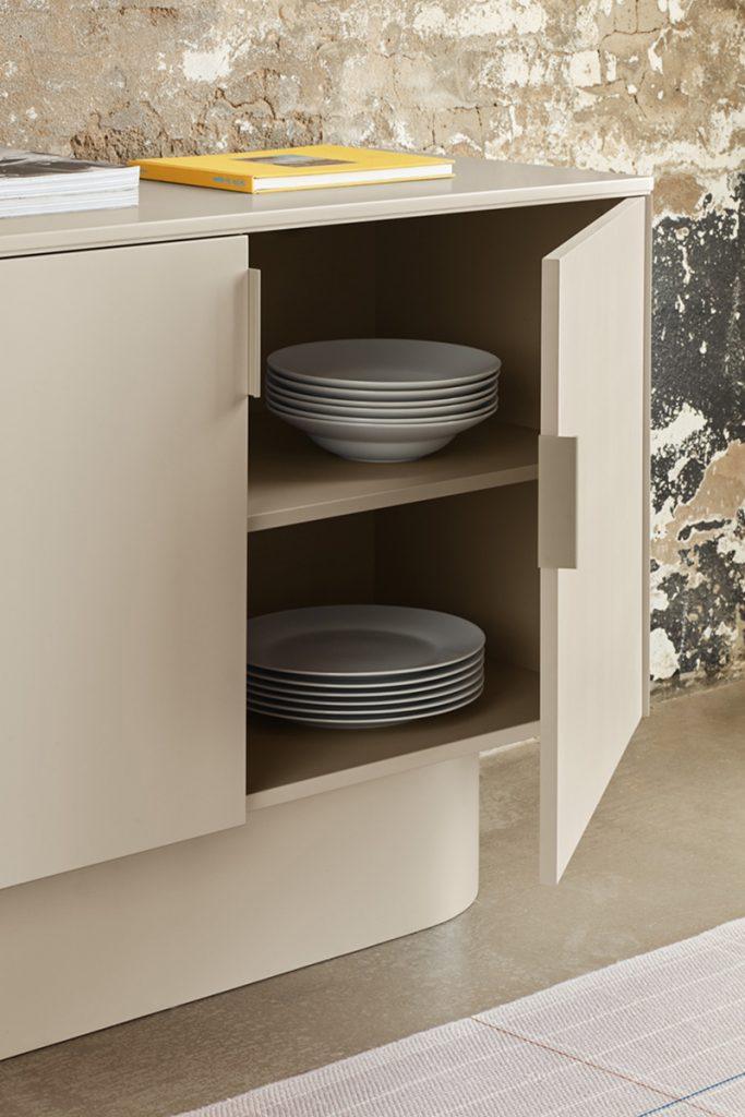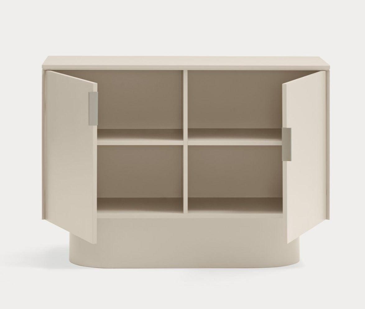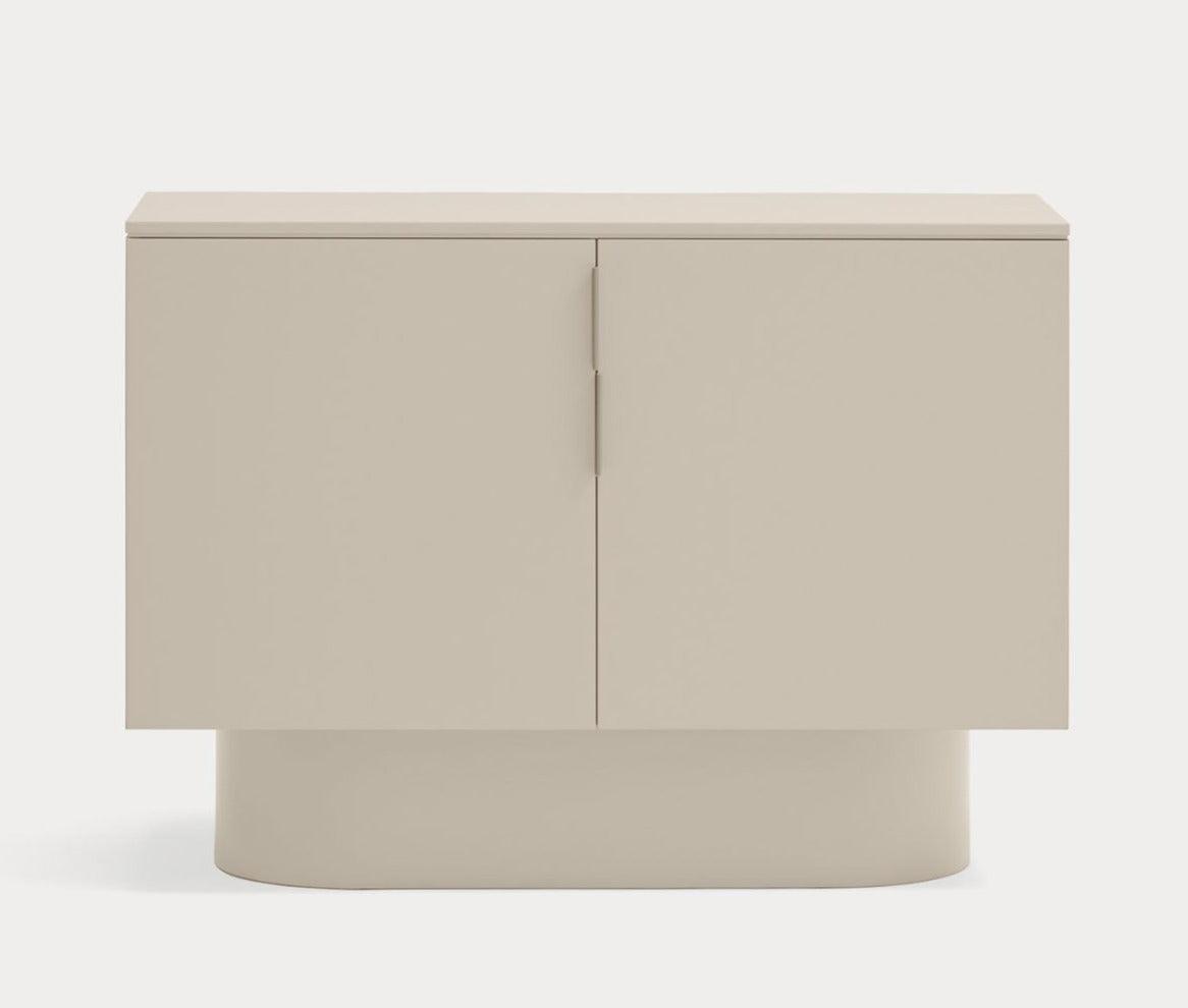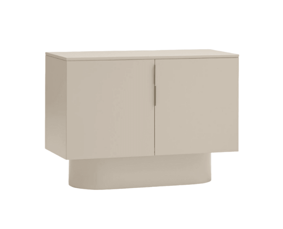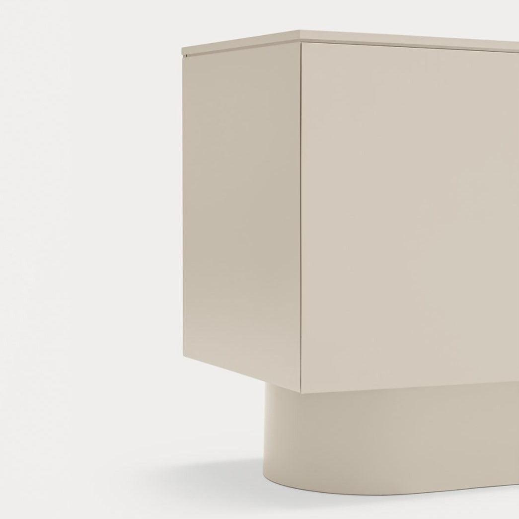 Szafka niska Totem w delikatnym kolorze beżowym przyciąga uwagę swoim niemal monolitycznym wyglądem, zachęcając do kontemplacji, jakby była to rzeźba przekraczająca granice między funkcją a formą.