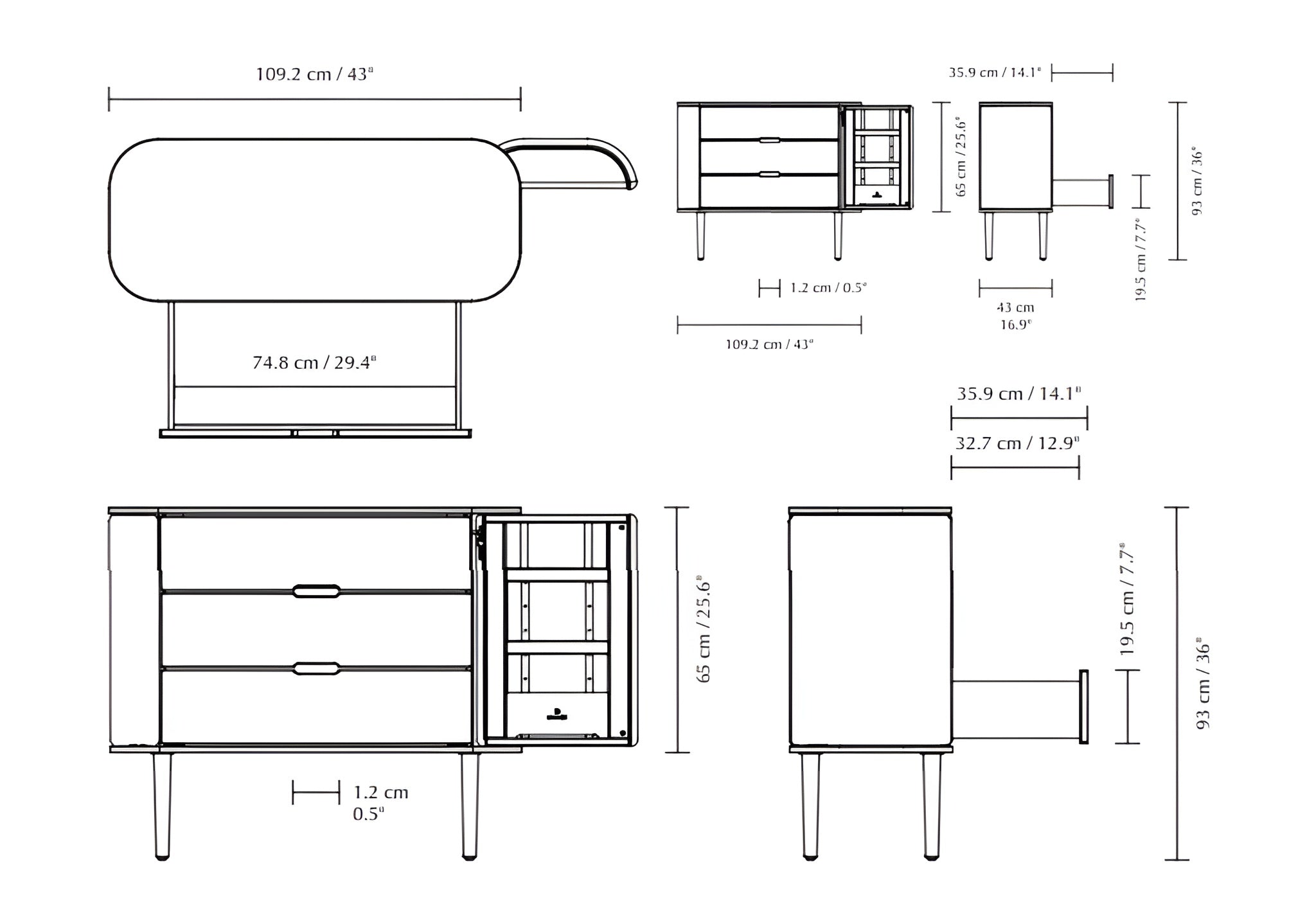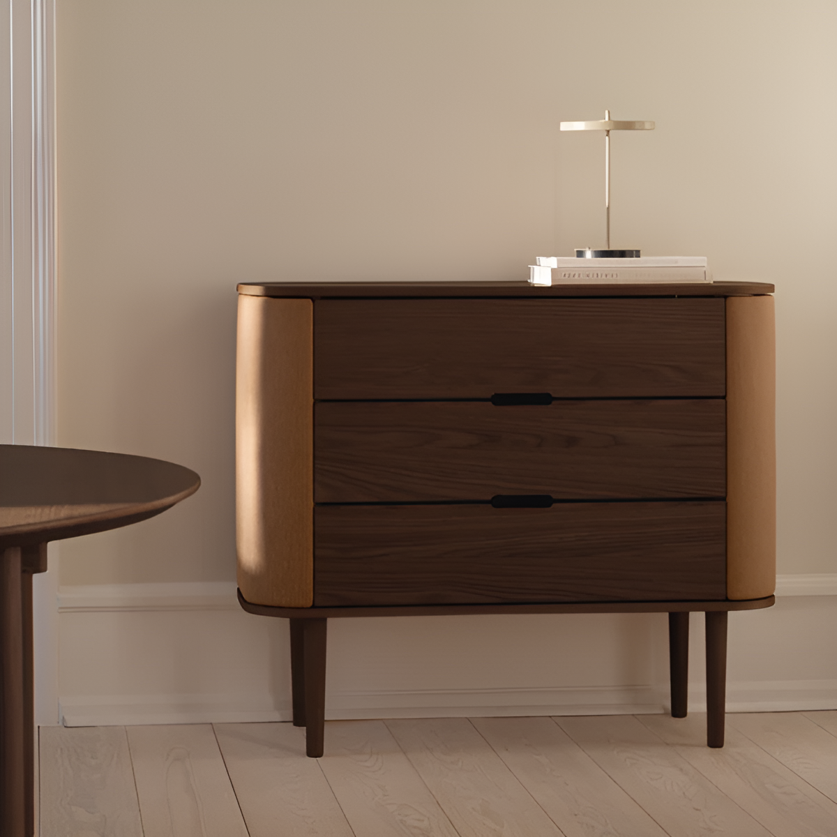 De Treasures Dresser is een elegante en functionele kast die subtiele rondingen combineert met praktische opbergruimte. Achter de afgeronde zijdeurtjes, die openen als vleugels, bevindt zich een plek voor sieraden en kleine voorwerpen. Drie ruime lades zonder handgrepen bieden ruimte voor truien, servies of kantooraccessoires.