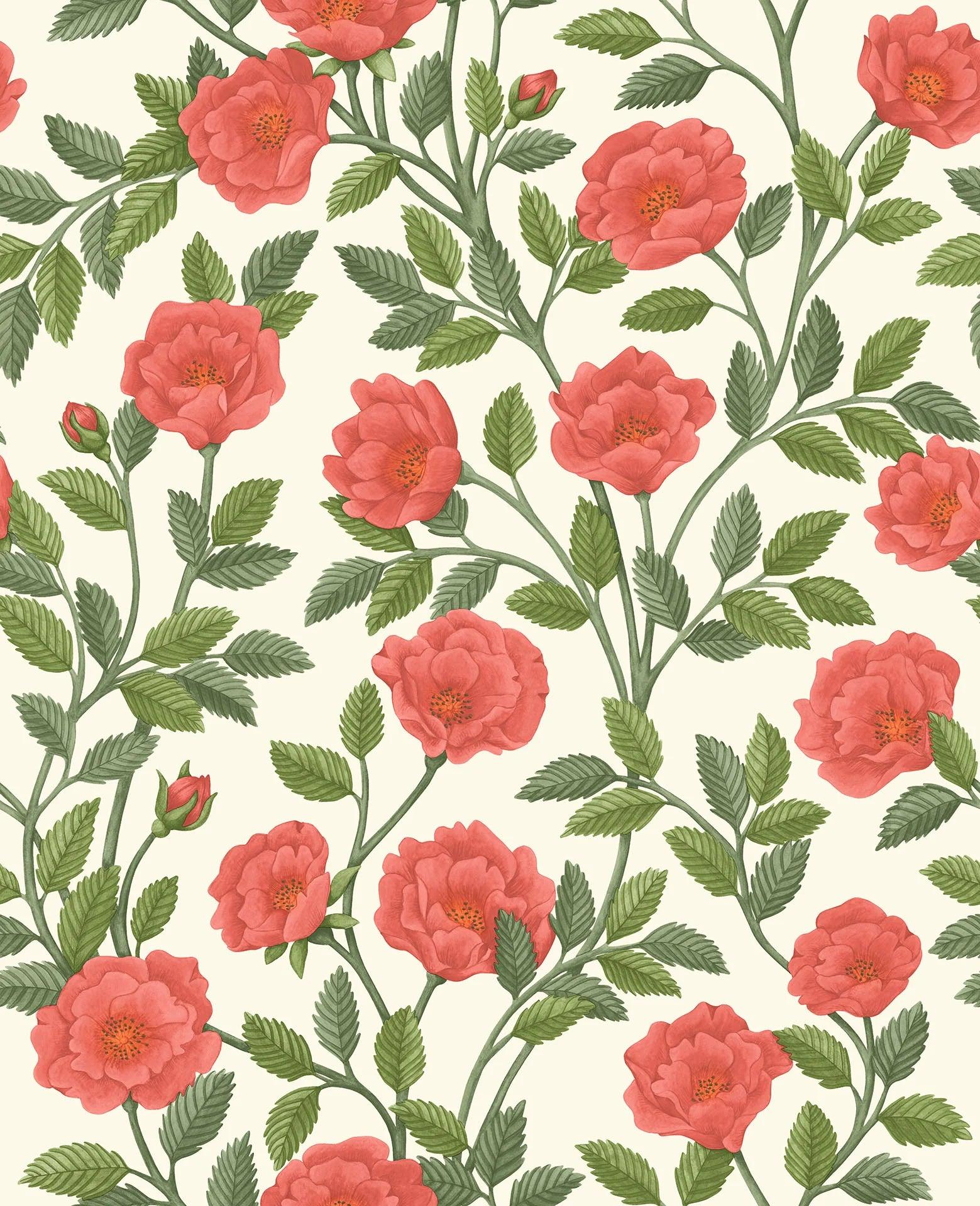 Prachtige behang Hampton Roses met bloeiende rozen, is geïnspireerd op de tuinen van het Hampton Court Paleis, dat al meer dan 500 jaar de traditie van het planten van rozen heeft. Tegenwoordig zijn er veel variëteiten van deze koningin der bloemen, waaronder Engelse rozen, theerozen, klimrozen en wilde rozen, waarvan de levendige schoonheid dit verbluffende ontwerp inspireert.