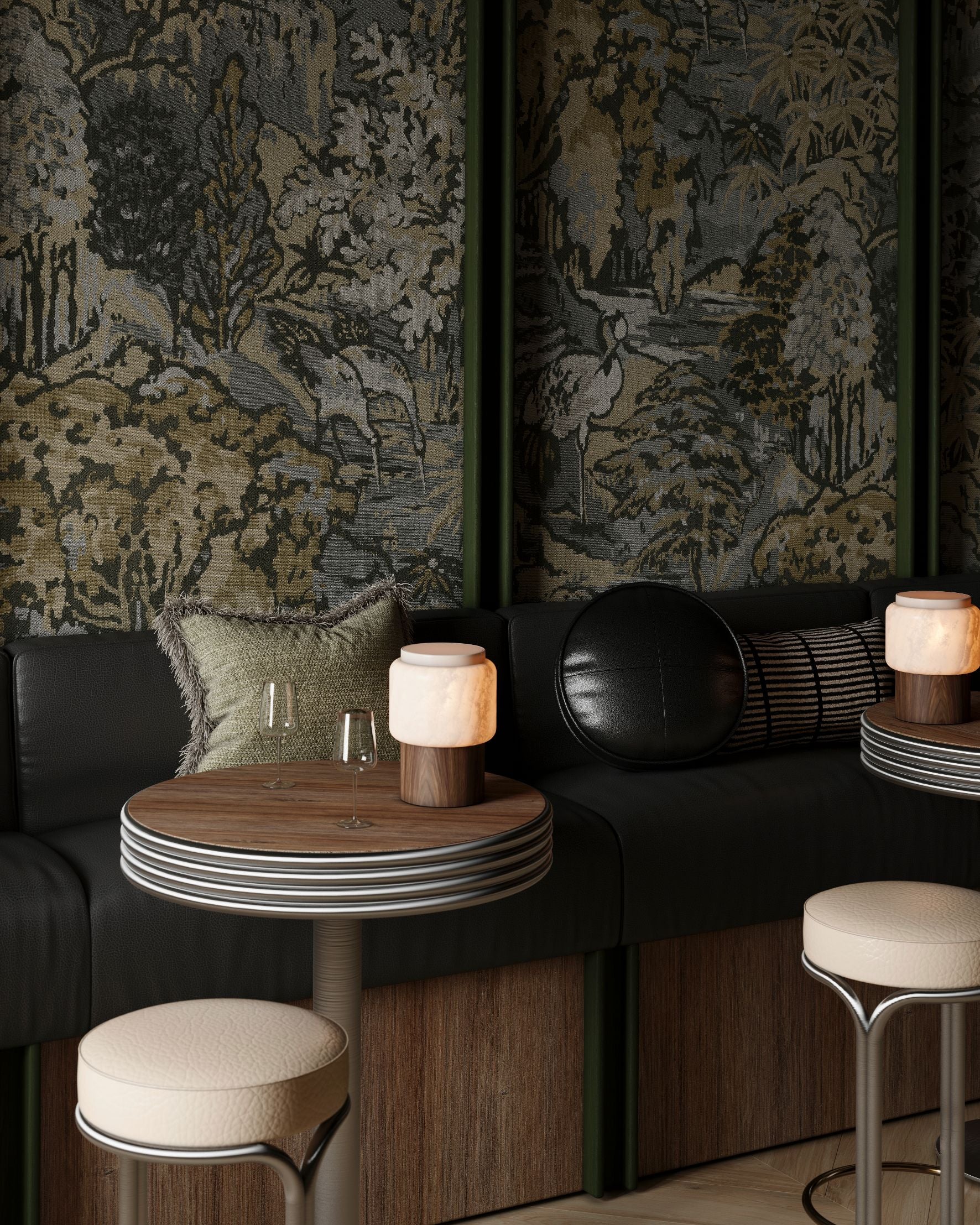 Behang Riverbank is een unieke decoratie geïnspireerd op klassieke wandtapijten, die een weelderig rivierlandschap toont met een kraanvogel verborgen in het groen. Dit motief verwijst naar de symboliek van geluk en lang leven, waardoor de ruimte een diepere betekenis en harmonieuze karakter krijgt. De opzettelijk gepixelde tekening vormt een subtiele verwijzing naar de esthetiek van het midden van de 20e eeuw, en creëert een interessante combinatie van traditie en moderniteit.