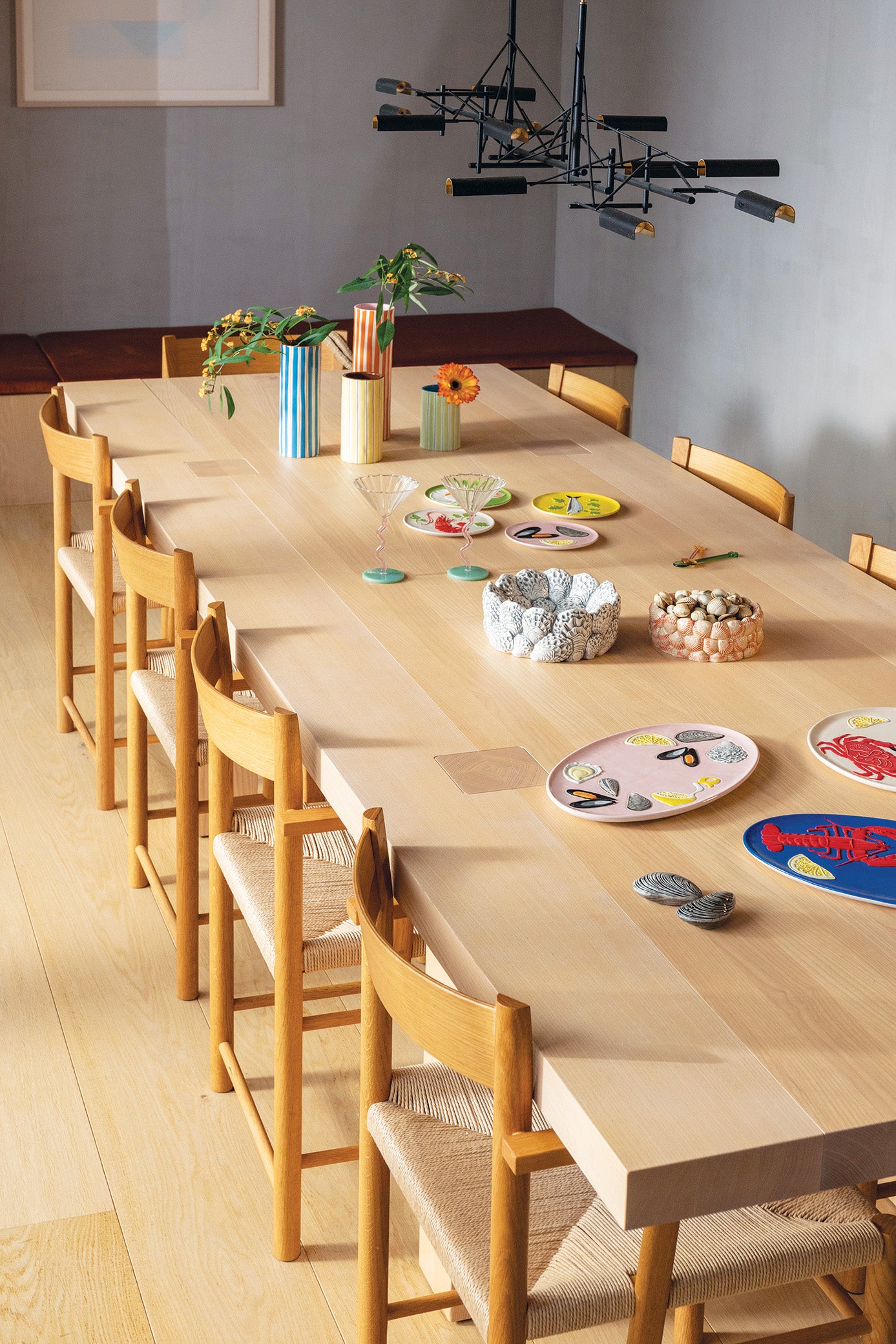 Vaas Ray in tinten van groen en blauw is een uitstekende manier om kleur en karakter toe te voegen aan elke tafelopstelling. Het handgeschilderde gestreepte patroon maakt de vaas uniek, en zijn onregelmatige vorm geeft het een artistieke uitstraling.