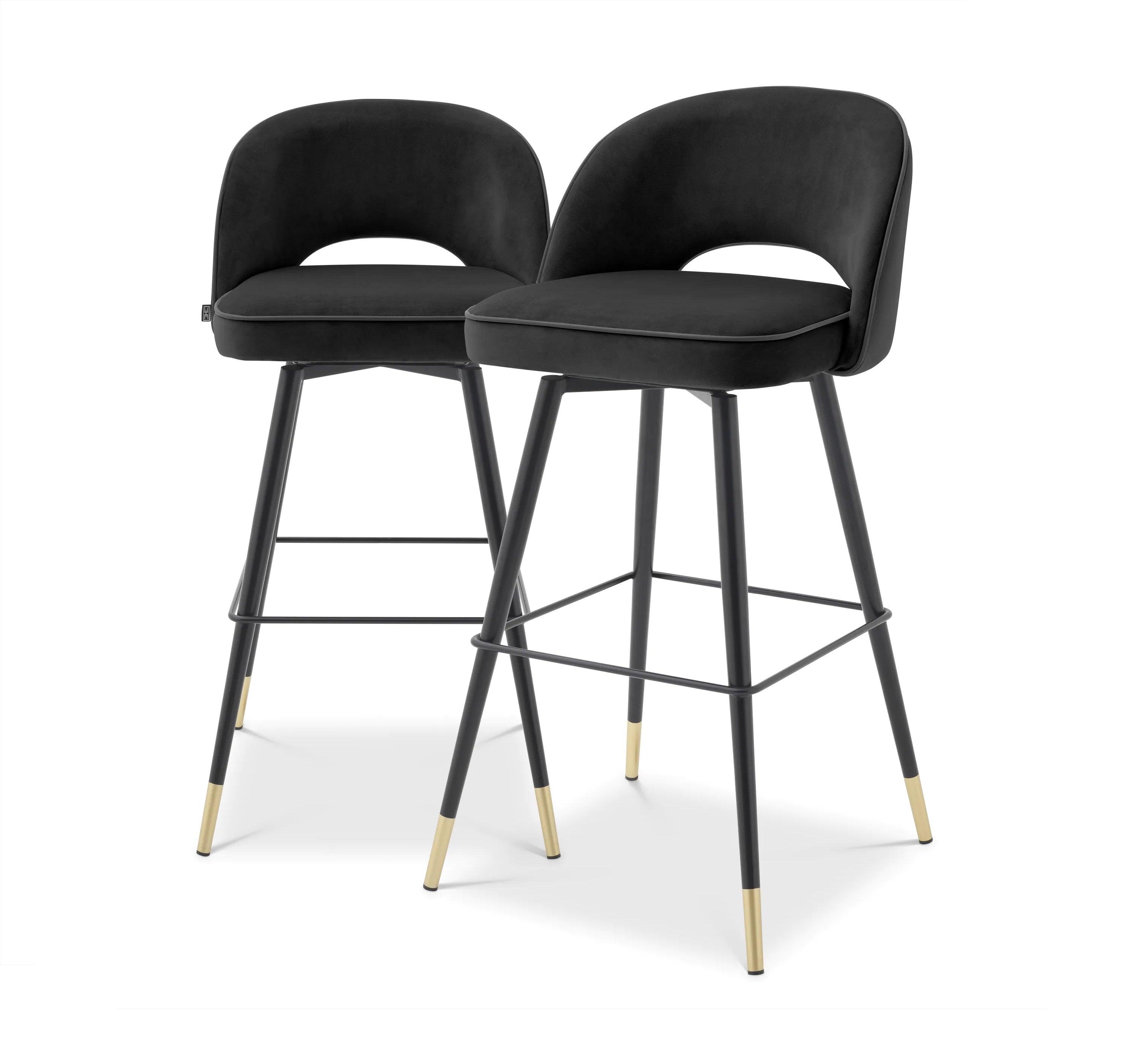 Zorg voor elegantie en verfijning in uw interieur met de hockers Cliff. De set van twee fluwelen hockers belichaamt luxe en klasse. Elke zwarte hocker heeft een stevige frame dat rust op zwarte, taps toelopende poten met een uitstekende accent in de vorm van gouden opzetstukken. Hun uniekheid wordt benadrukt door de armloze rugleuning, die kunstzinnig aan de onderkant van de zitting is geopend, wat het ontwerp een gevoel van lichtheid geeft.